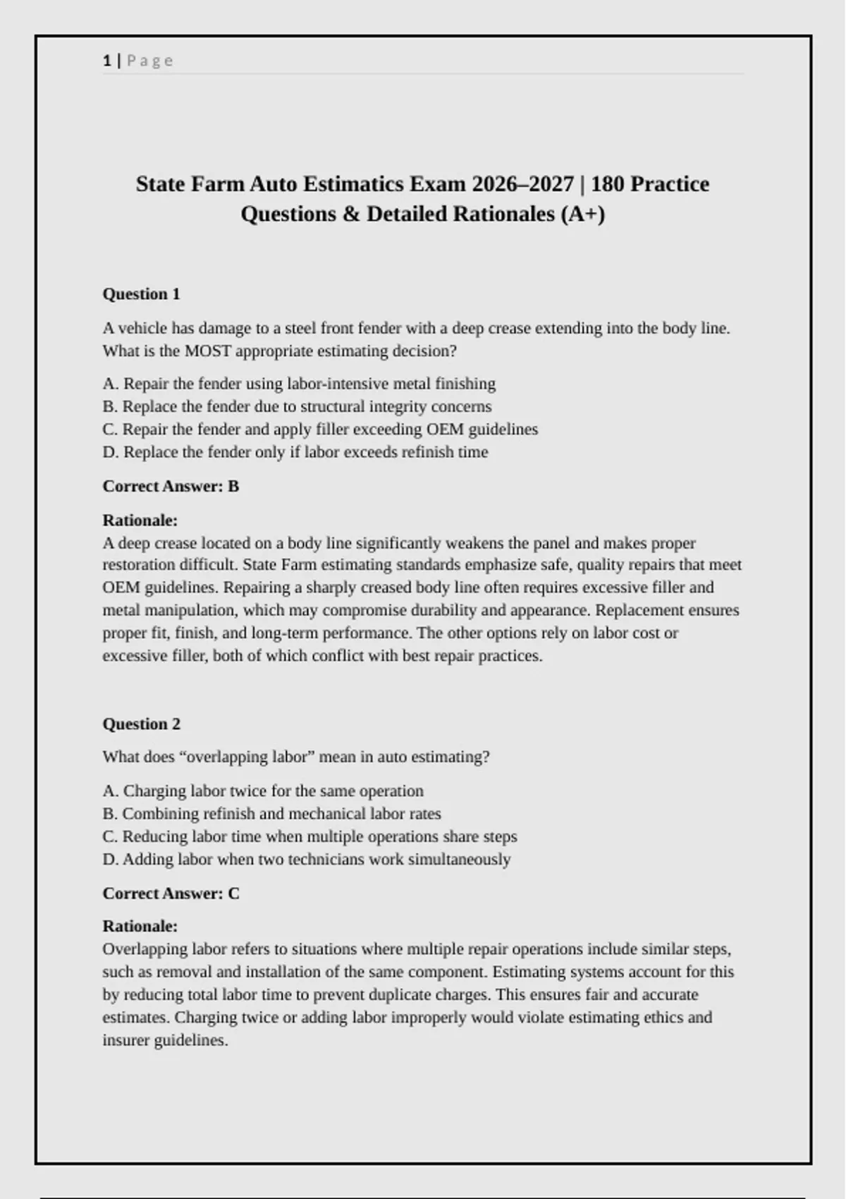 Prepare with confidence for the State Farm Auto Estimatics Exam 2026–2027 using this complete 180-question practice exam. Each question includes ABCD multiple-choice options, the correct answer, and a clear, paragraph-style rationale designed to mirror real exam logic. Content covers estimating fundamentals, OEM procedures, repair versus replace decisions, structural and refinish considerations, documentation standards, supplements, total loss evaluation, and ethical estimating practices. Questions are professionally structured, graded A+, and formatted for realistic exam preparation. Ideal for adjusters, appraisers, and estimators seeking accuracy, consistency, and defensible estimating skills. Perfect for self-study, training programs, and certification readiness for modern insurance claims environments nationwide.