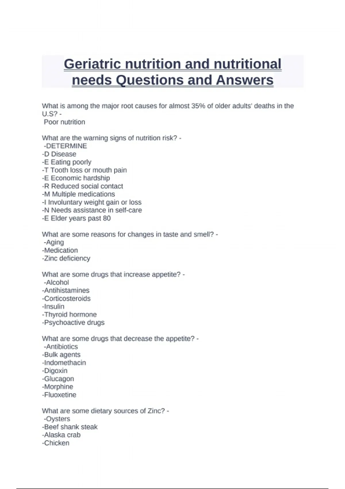 This document covers an answered study guide for a Geriatric Nutrition exam, focusing on nutritional needs, assessment, and interventions for older adults. It includes key concepts such as age-related physiological changes, chronic disease considerations, and dietary planning. The material is designed to support exam preparation and reinforce practical clinical knowledge.