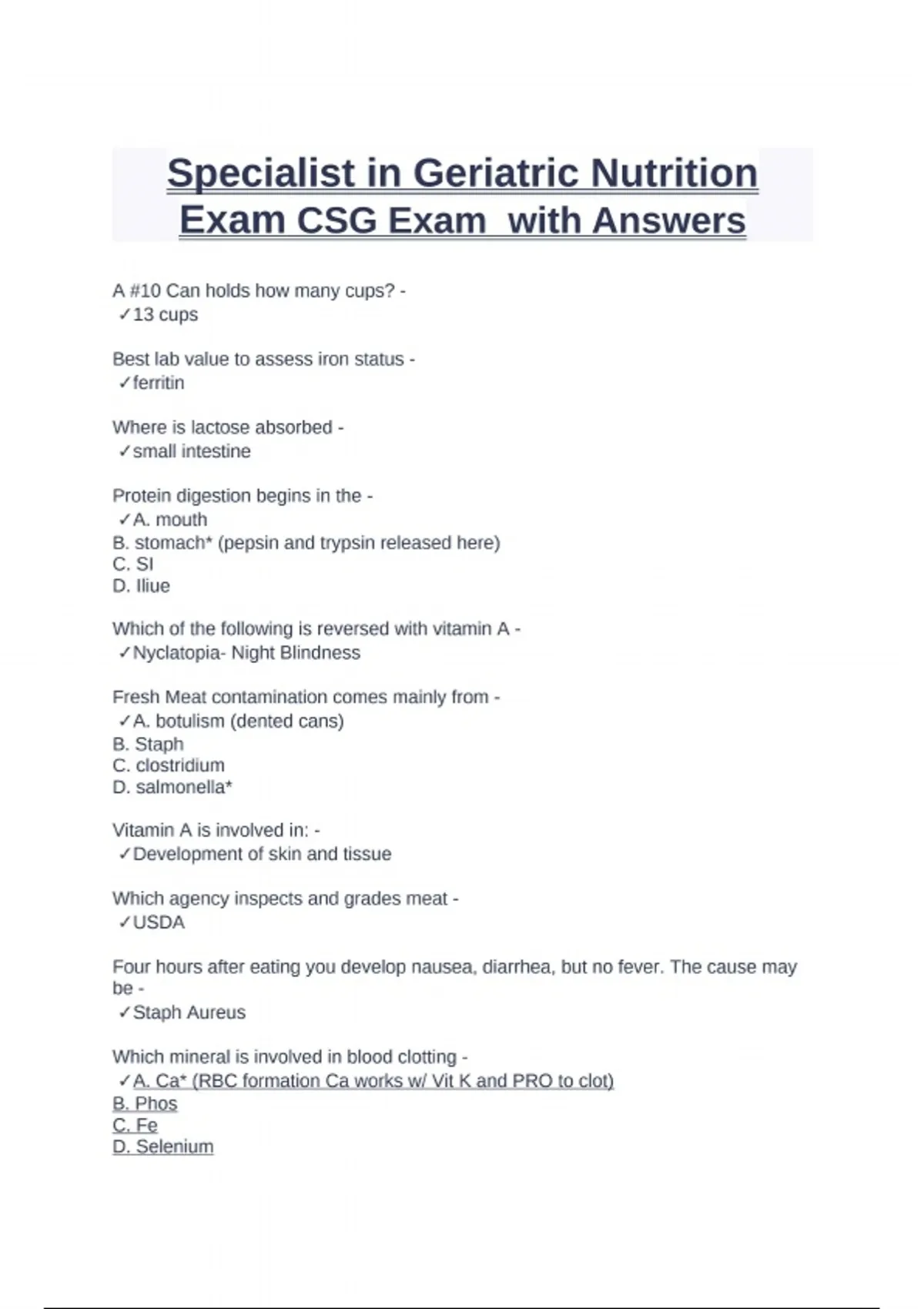 This document covers exam-style questions with verified correct answers for the Certified Specialist in Geriatric Nutrition (CSG) exam. It focuses on nutritional assessment, age-related physiological changes, chronic disease management, and evidence-based dietary interventions for older adults. The material is designed to support focused study and successful exam preparation.