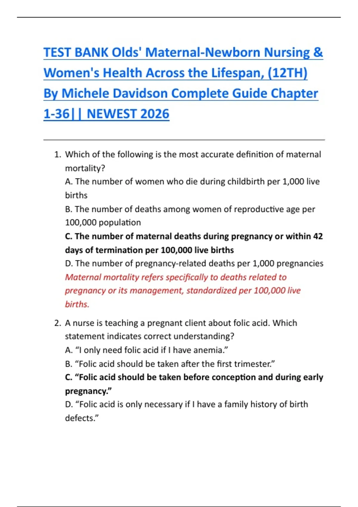 TEST BANK Olds' Maternal-Newborn Nursing & Women's Health Across the Lifespan, (12TH) By Michele Davidson Complete Guide Chapter 1-36|| NEWEST 2026
