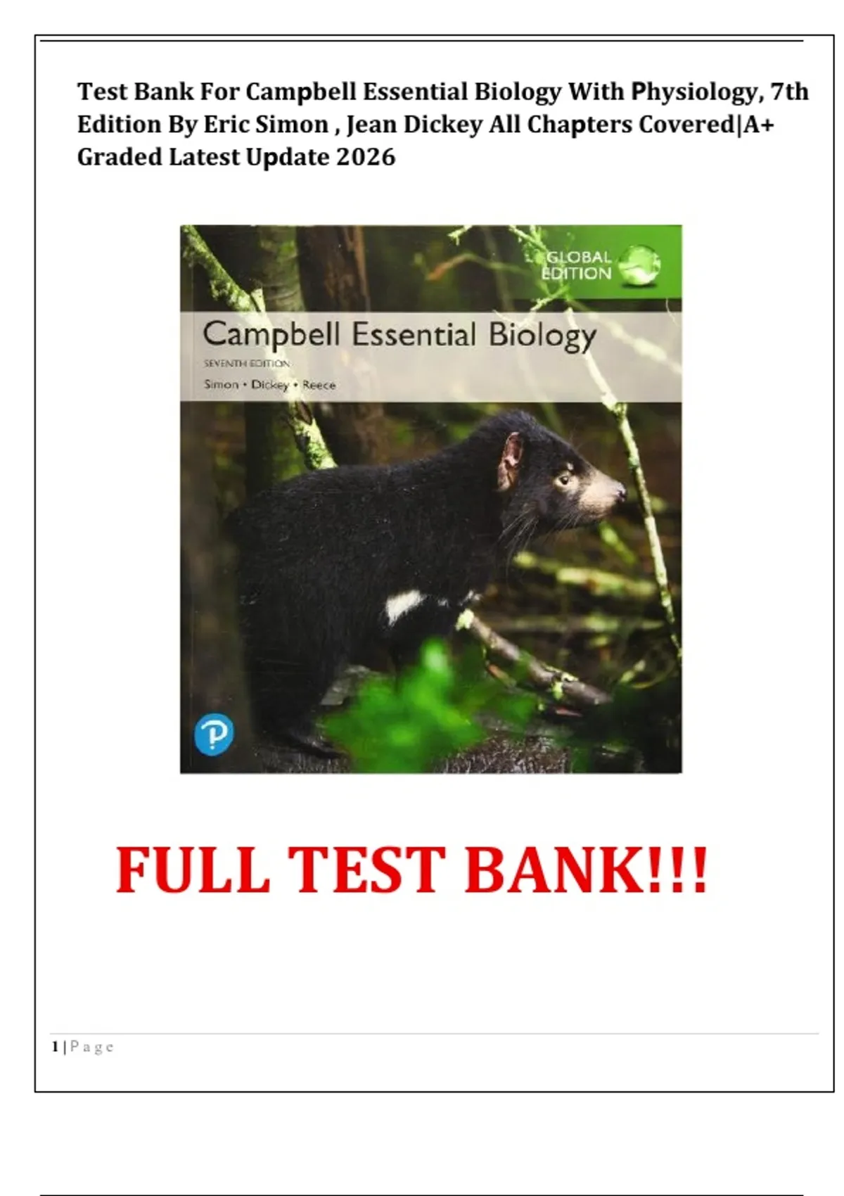 Test Bank For Campbell Essential Biology With Physiology, 7th Edition By Eric Simon , Jean Dickey All Chapters Covered|A+ Graded Latest Update 2026
