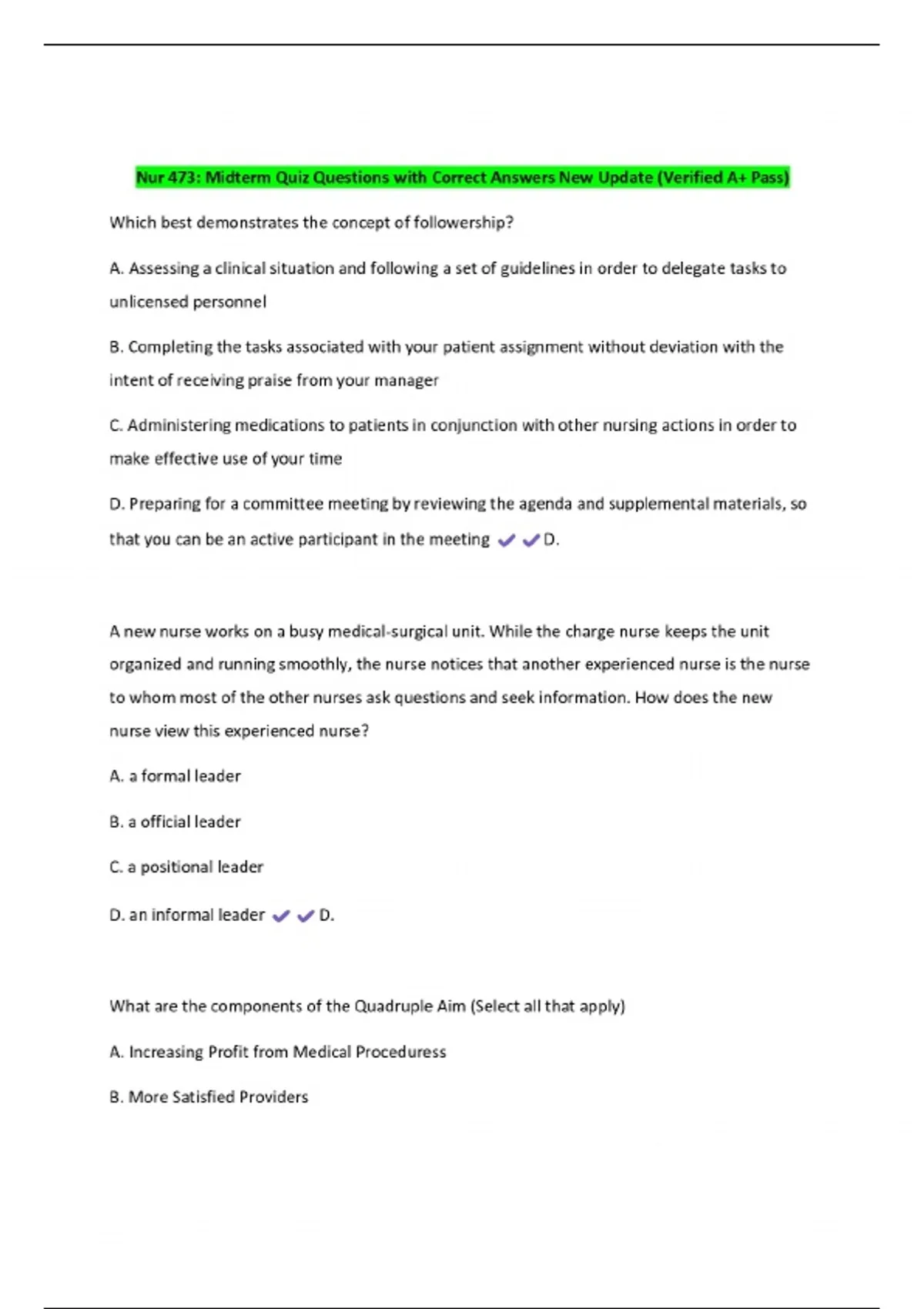 Nur 473: Midterm Quiz Questions with Correct Answers New Update (Verified A+ Pass)