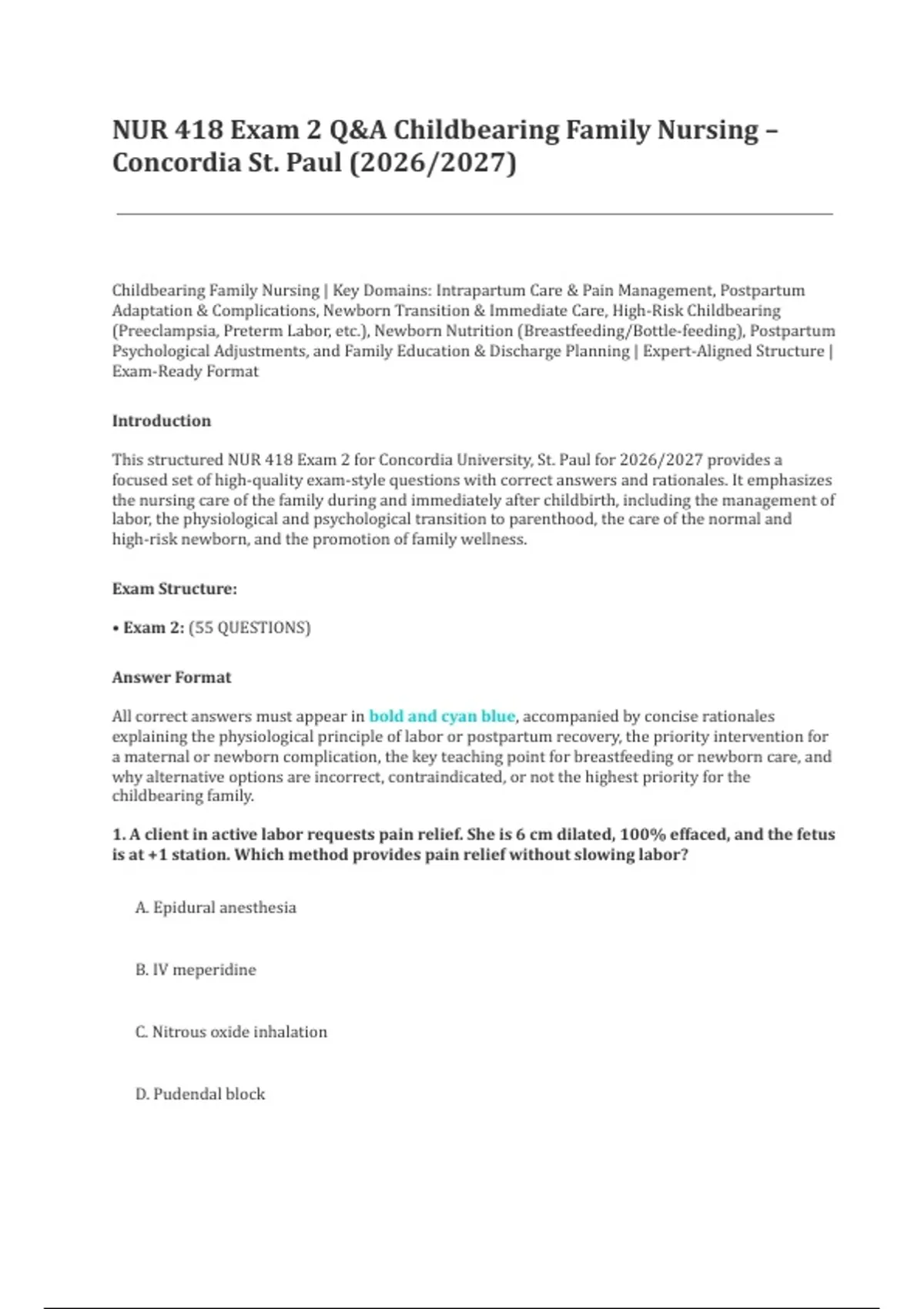 This structured NUR 418 Exam 2 for Concordia University, St. Paul for 2026/2027 provides a