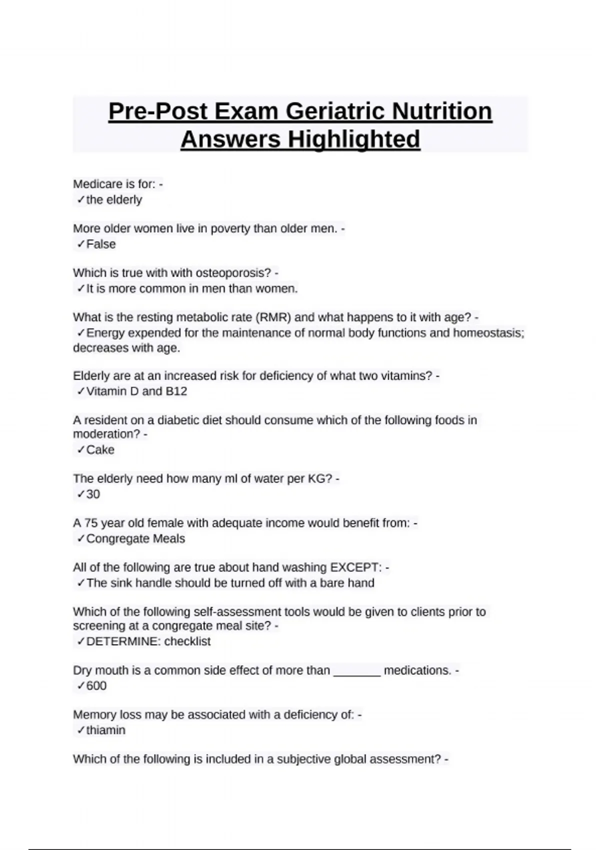 Pre-Post Exam Geriatric Nutrition Answers Highlighted