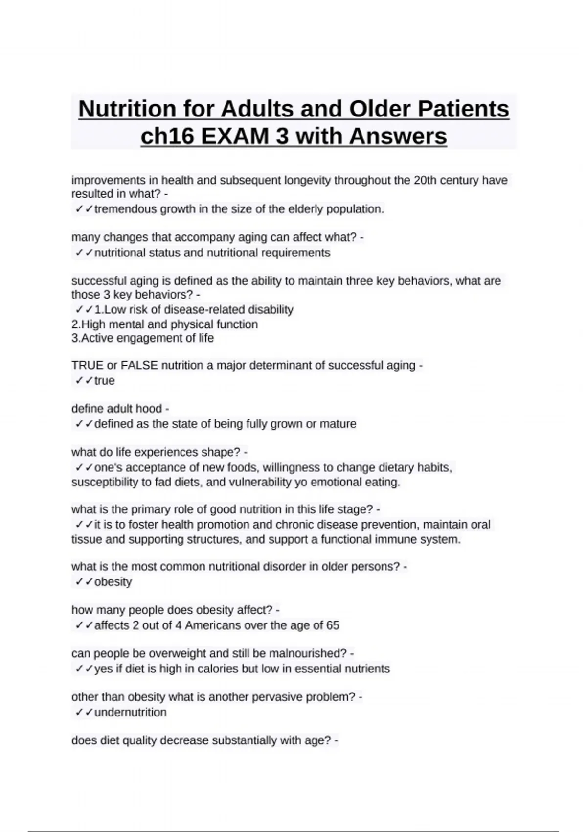 Nutrition for Adults and Older Patients ch16 EXAM 3 with Answers
