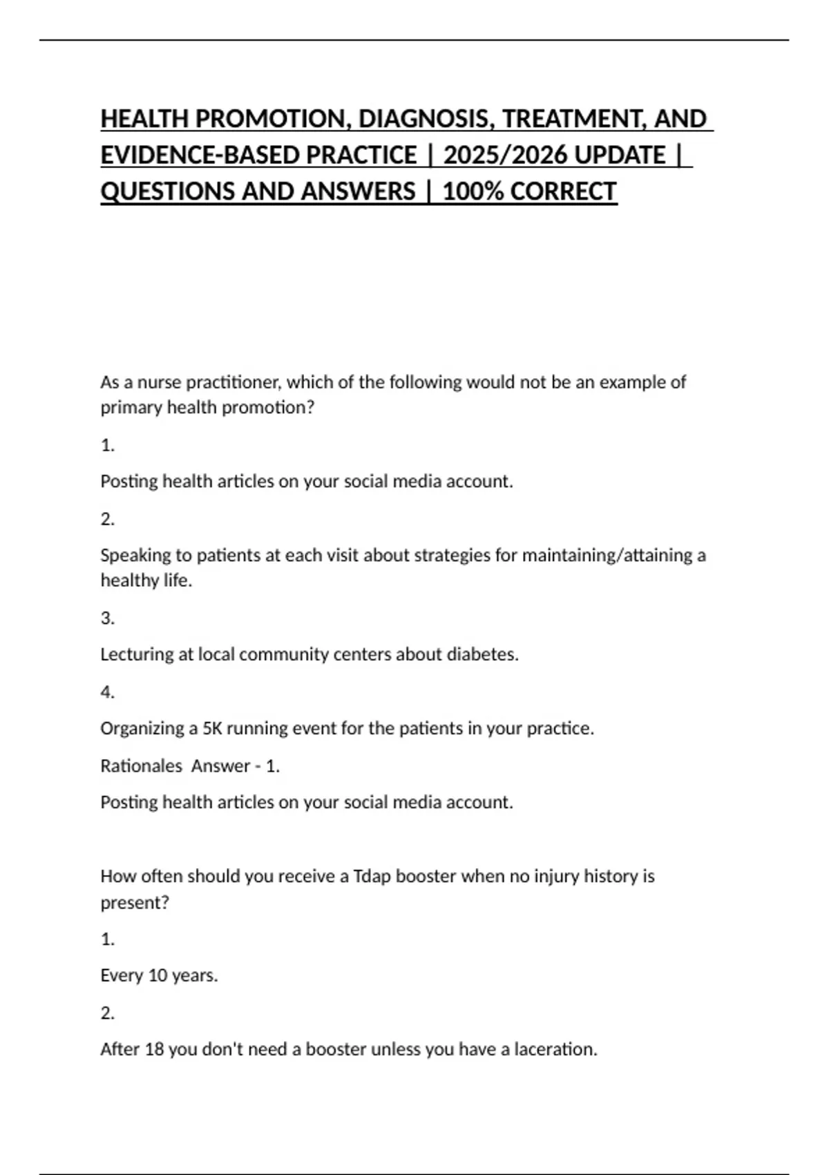 HEALTH PROMOTION, DIAGNOSIS, TREATMENT, AND EVIDENCE-BASED PRACTICE | 2025/2026 UPDATE | QUESTIONS AND ANSWERS | 100% CORRECT