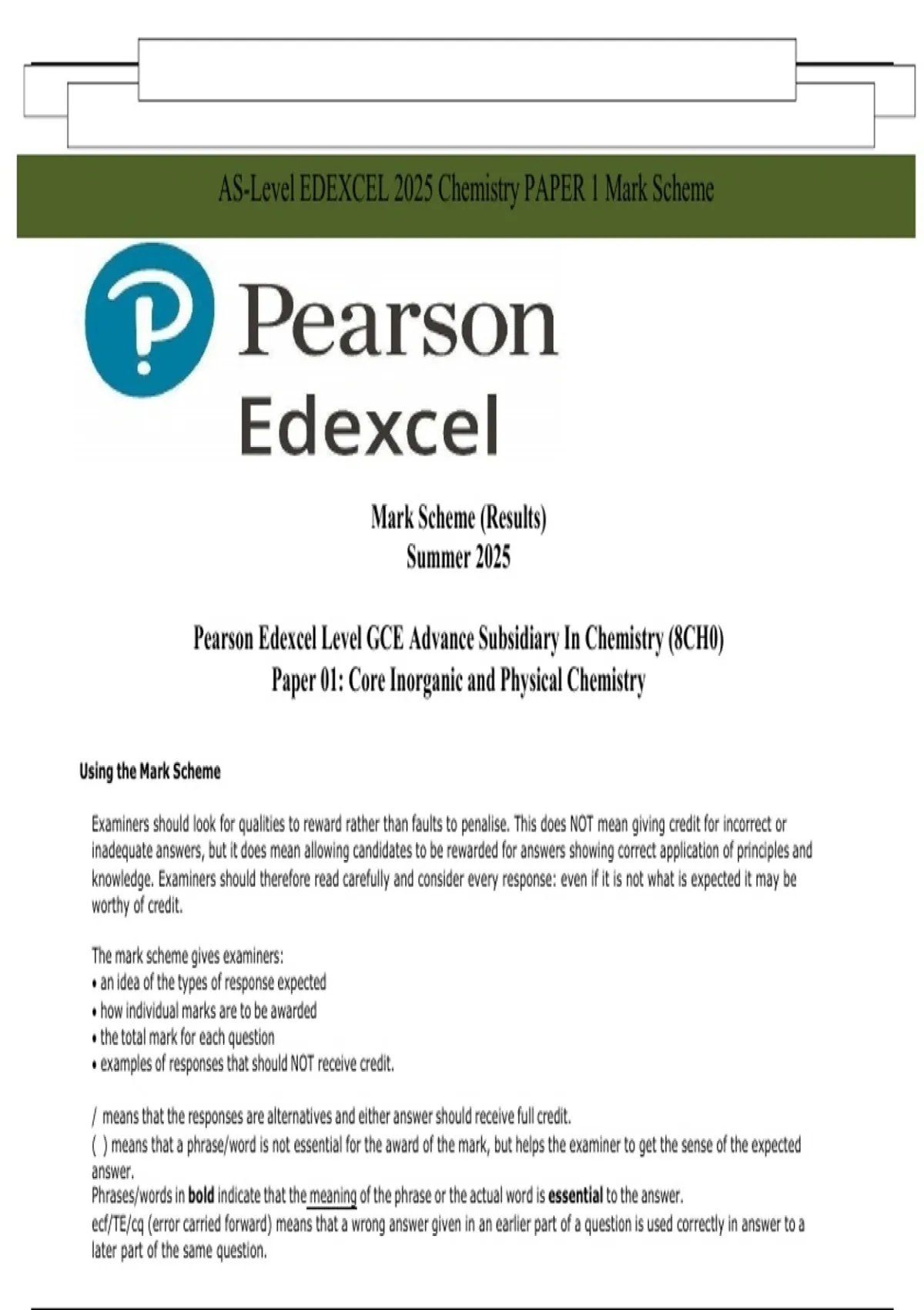 AS-Level EDEXCEL 2025 Chemistry PAPER 1 Mark Scheme