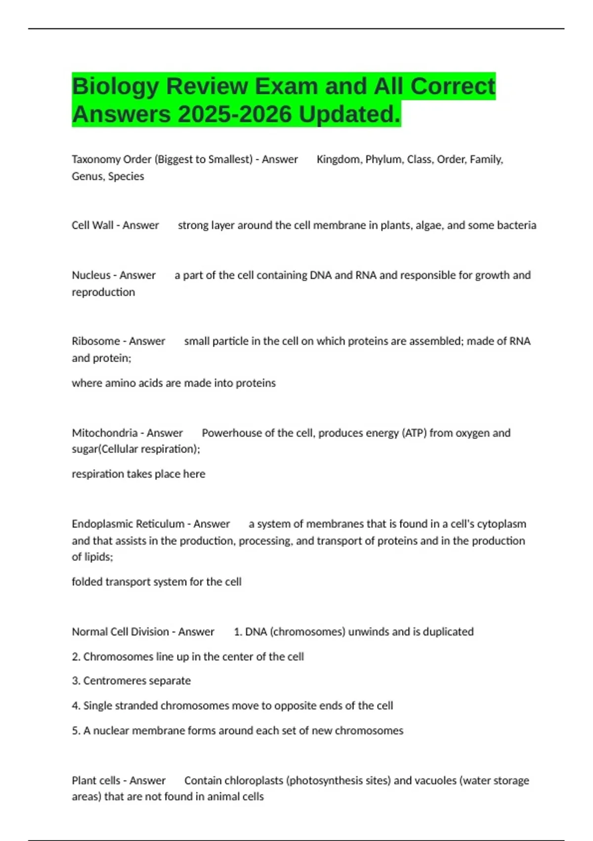 Taxonomy Order (Biggest to Smallest) - Answer Kingdom, Phylum, Class, Order, Family, Genus, Species Cell Wall - Answer strong layer around the cell membrane in plants, algae, and some bacteria Nucleus - Answer a part of the cell containing DNA and RNA and responsible for growth and reproduction Ribosome - Answer small particle in the cell on which proteins are assembled; made of RNA and protein; where amino acids are made into proteins Mitochondria - Answer Powerhouse of the cell, produces energy (ATP) from oxygen and sugar(Cellular respiration); respiration takes place here Endoplasmic Reticulum - Answer a system of membranes that is found in a cell's cytoplasm and that assists in the production, processing, and transport of proteins and in the production of lipids; folded transport system for the cell Normal Cell Division - Answer 1. DNA (chromosomes) unwinds and is duplicated 2. Chromosomes line up in the center of the cell 3. Centromeres separate 4. Single stranded chromosomes move to opposite ends of the cell 5. A nuclear membrane forms around each set of new chromosomes Plant cells - Answer Contain chloroplasts (photosynthesis sites) and vacuoles (water storage areas) that are not found in animal cells Photosynthesis - Answer Plant cells turn sunlight, carbon dioxide and water into carbohydrates