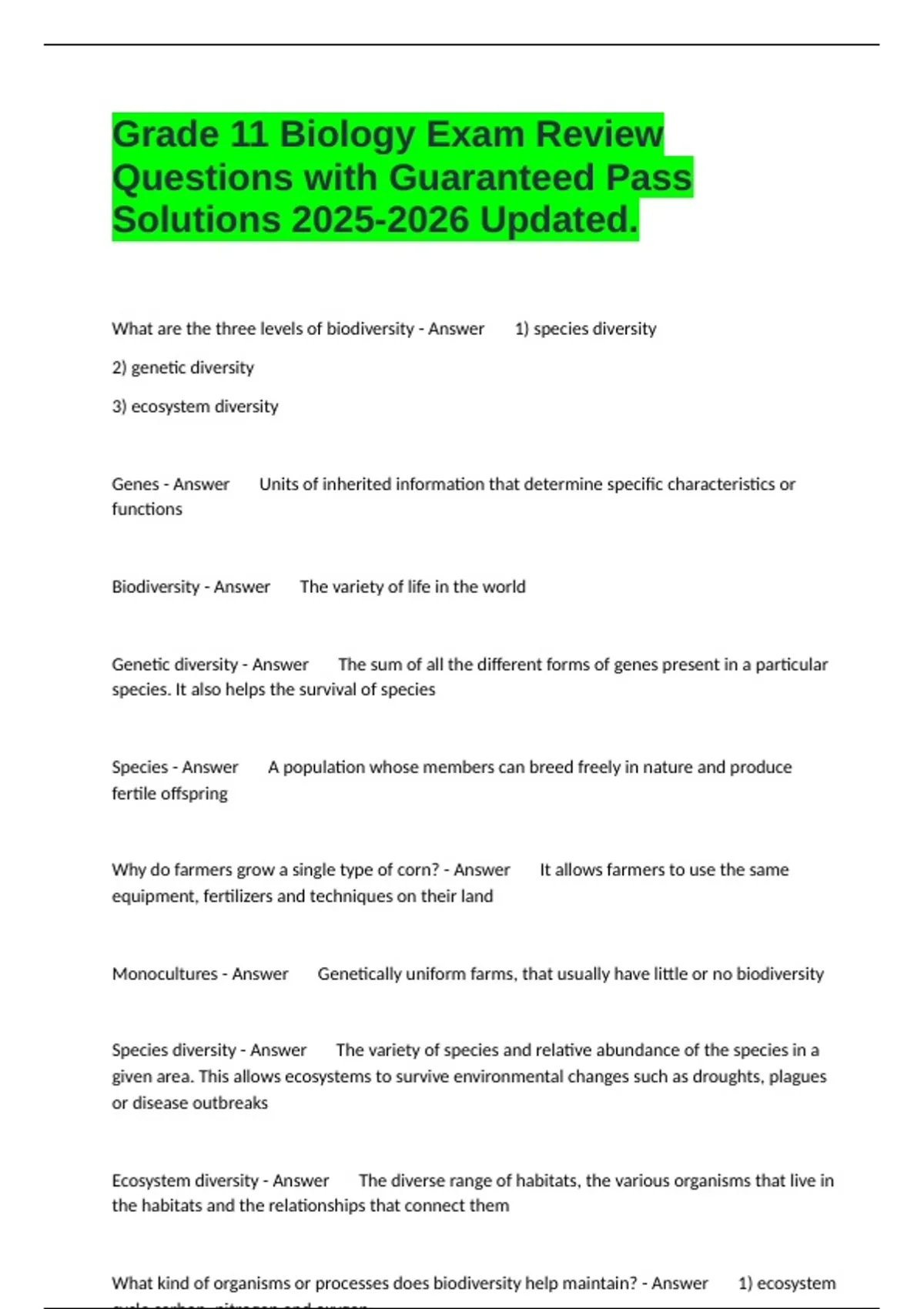 Grade 12 Biology Exam Review Questions and Already Passed Answers Updated.