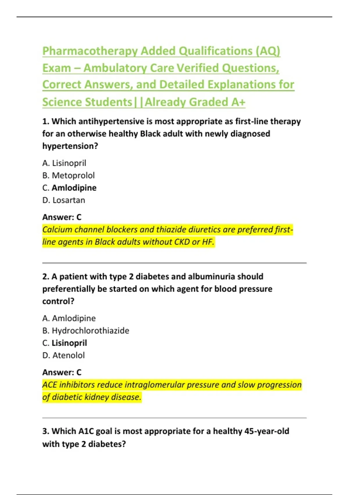 Pharmacotherapy Added Qualifications (AQ) Exam – Ambulatory Care Verified Questions, Correct Answers, and Detailed Explanations for Science Students||Already Graded A+