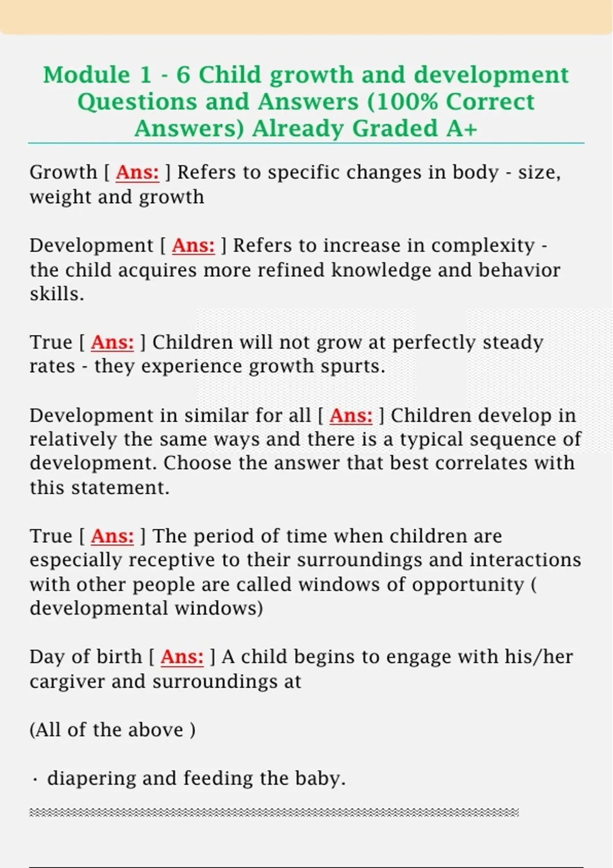 Module 1 - 6 Child growth and development Questions and Answers (100% Correct Answers) Already Graded A+ Module 1 - 6 Child growth and development Questions and Answers (100% Correct Answers) Already Graded A+