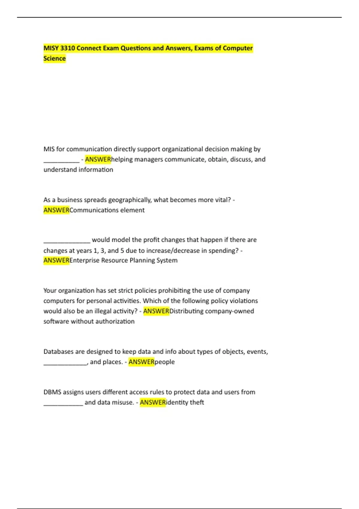 MISY 3310 Connect Exam Questions and Answers, Exams of Computer