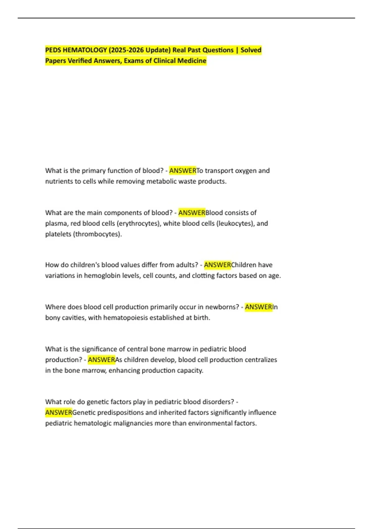 PEDS HEMATOLOGY ( Update) Real Past Questions | Solved Papers Verified Answers, Exams of Clinical Medicine