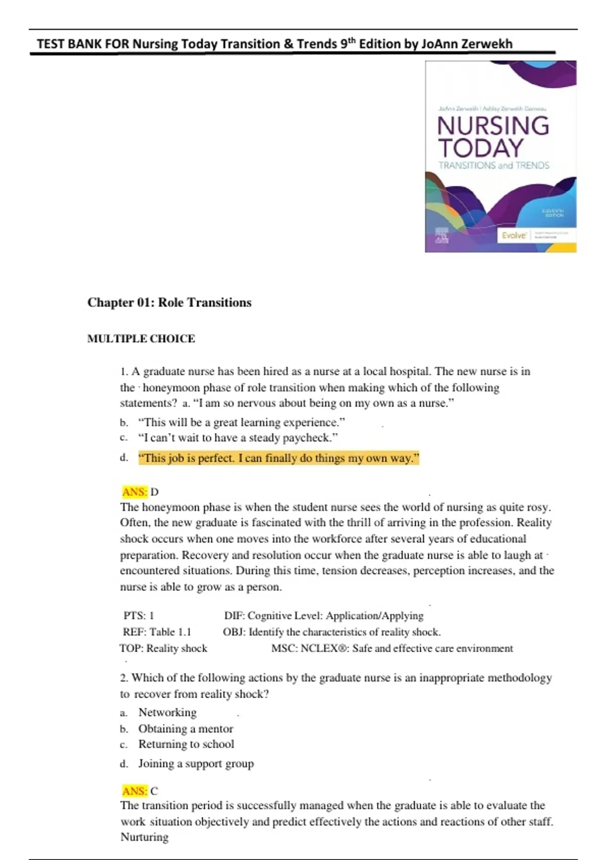 TEST BANK FOR Nursing Today Transition & Trends 9th Edition by JoAnn Zerwekh
