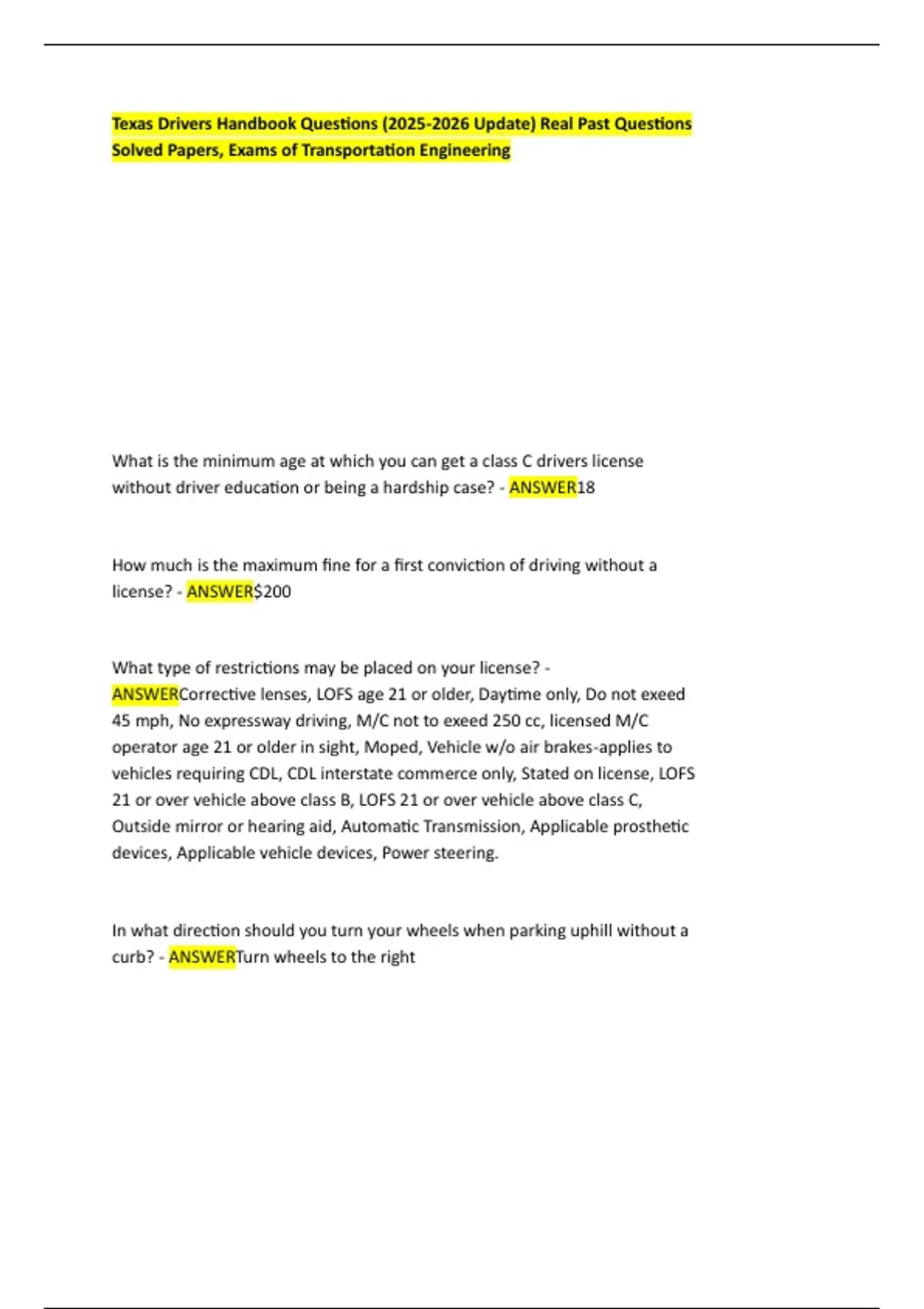 Texas Drivers Handbook Questions (2025-2026 Update) Real Past Questions