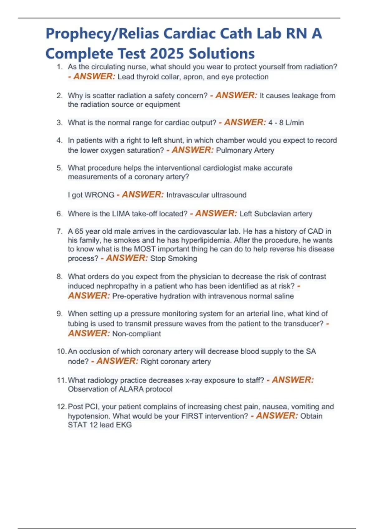Prophecy/Relias Cardiac Cath Lab RN A Complete Test 2025 Solutions
