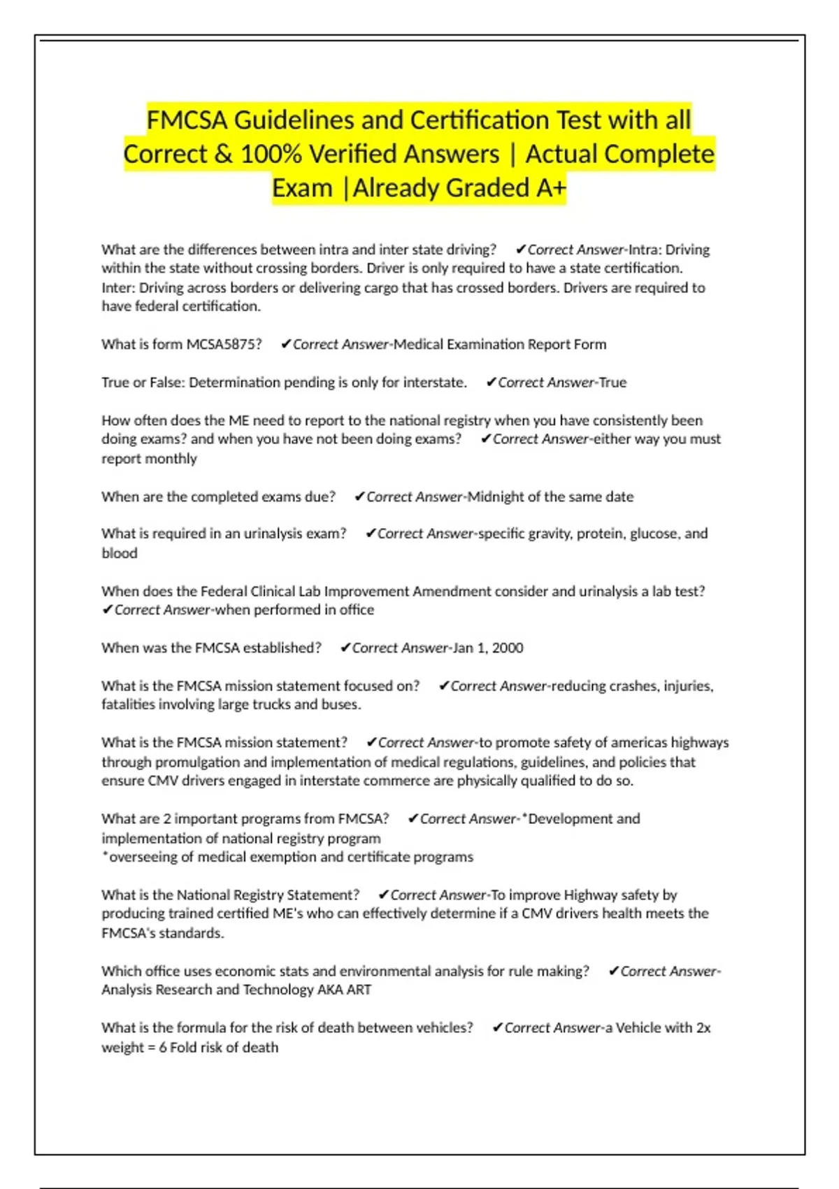 FMCSA Guidelines and Certification Test with all Correct & 100% Verified Answers | Actual Complete Exam |Already Graded A+