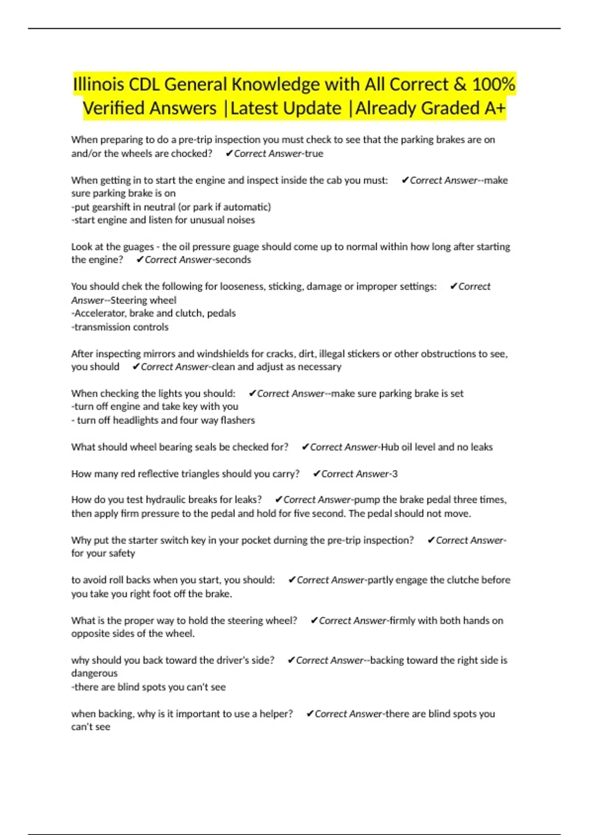 Illinois CDL General Knowledge with All Correct & 100% Verified Answers |Latest Update |Already Graded A+