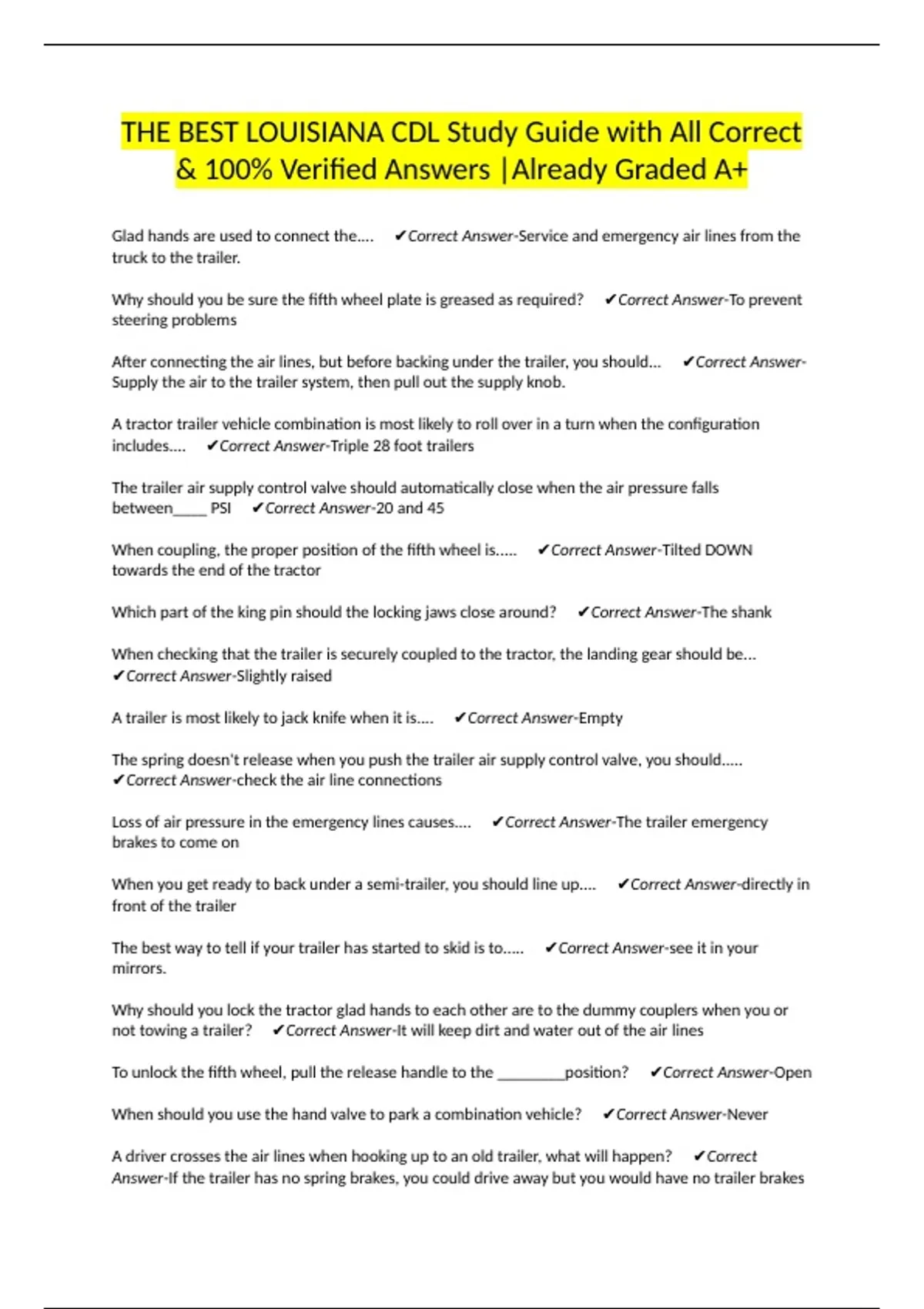 THE BEST LOUISIANA CDL Study Guide with All Correct & 100% Verified Answers |Already Graded A+