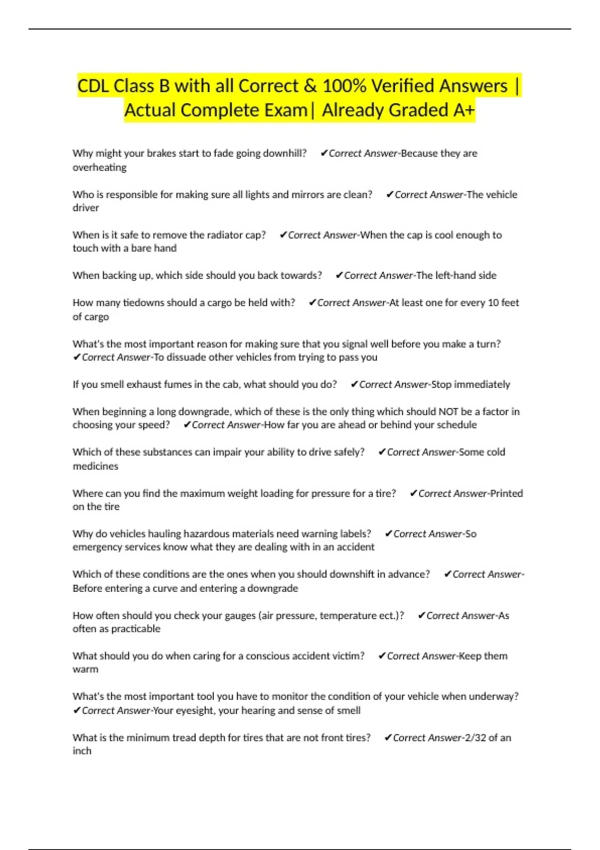 CDL Class B with all Correct & 100% Verified Answers |Actual Complete Exam| Already Graded A+