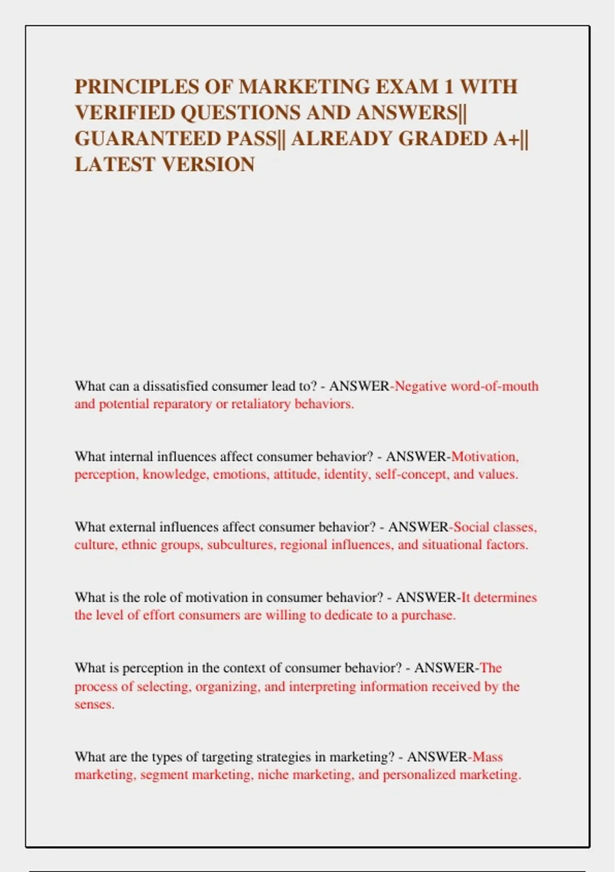 PRINCIPLES OF MARKETING EXAM 1 WITH VERIFIED QUESTIONS AND ANSWERS|| GUARANTEED PASS|| ALREADY GRADED A+|| LATEST VERSION What can a dissatisfied consumer lead to? - ANSWER-Negative word-of-mouth and potential reparatory or retaliatory behaviors. What internal influences affect consumer behavior? - ANSWER-Motivation, perception, knowledge, emotions, attitude, identity, self-concept, and values. What external influences affect consumer behavior? - ANSWER-Social classes, culture, ethnic groups, subcultures, regional influences, and situational factors. What is the role of motivation in consumer behavior? - ANSWER-It determines the level of effort consumers are willing to dedicate to a purchase. What is perception in the context of consumer behavior? - ANSWER-The process of selecting, organizing, and interpreting information received by the senses. What are the types of targeting strategies in marketing? - ANSWER-Mass marketing, segment marketing, niche marketing, and personalized marketing. What is positioning in marketing? - ANSWER-Defining the position that a brand occupies in consumers' minds and creating psychological associations with the product. What is the role of brand awareness in positioning? - ANSWER-It helps consumers recognize and recall the brand among competitors. What does targeting involve? - ANSWER-Selecting segments, markets, or customers that a business wants to compete with and win over. What is differentiation in marketing? - ANSWER-Designing a marketing mix with unique attributes valued by target customers and consistent with positioning. What are Points of Parity (POP)? - ANSWER-Attributes that approximately match those offered by the competition. What are Points of Difference (POD)? - ANSWER-Key attributes that give a brand or product a competitive advantage over competitors. What are the stages of perception? - ANSWER-Exposure, attention, and interpretation. What should students verify before submitting their exam? - ANSWER-Their markings and the exam version. What is the consequence of sitting in the wrong seat during the exam? - ANSWER-It may result in being marked absent for the exam. What is the definition of motivation in consumer psychology? - ANSWER Conclusions that consumers can draw based on marketing stimuli, influenced by their beliefs. What factors should be considered for targeting? - ANSWER-Size, adaptation, growth, cost, profitability, accessibility, and competitive situation. What is the difference between segment marketing and niche marketing? - ANSWER-Segment marketing adapts the marketing mix for different groups, while niche marketing targets a very small and specific segment. What is the importance of customer loyalty in behavioral variables? - ANSWER-It indicates how likely customers are to return and make repeat purchases. What is the significance of understanding customer needs in segmentation? - ANSWER-It helps tailor marketing strategies to meet specific preferences and decision processes. What are the implications of too sophisticated segmentation? - ANSWER-It can undermine a firm's profit by complicating marketing strategies. What does the term 'critical to a certain market' refer to? - ANSWER-Variables that are essential for understanding specific market segments but hard to generalize.