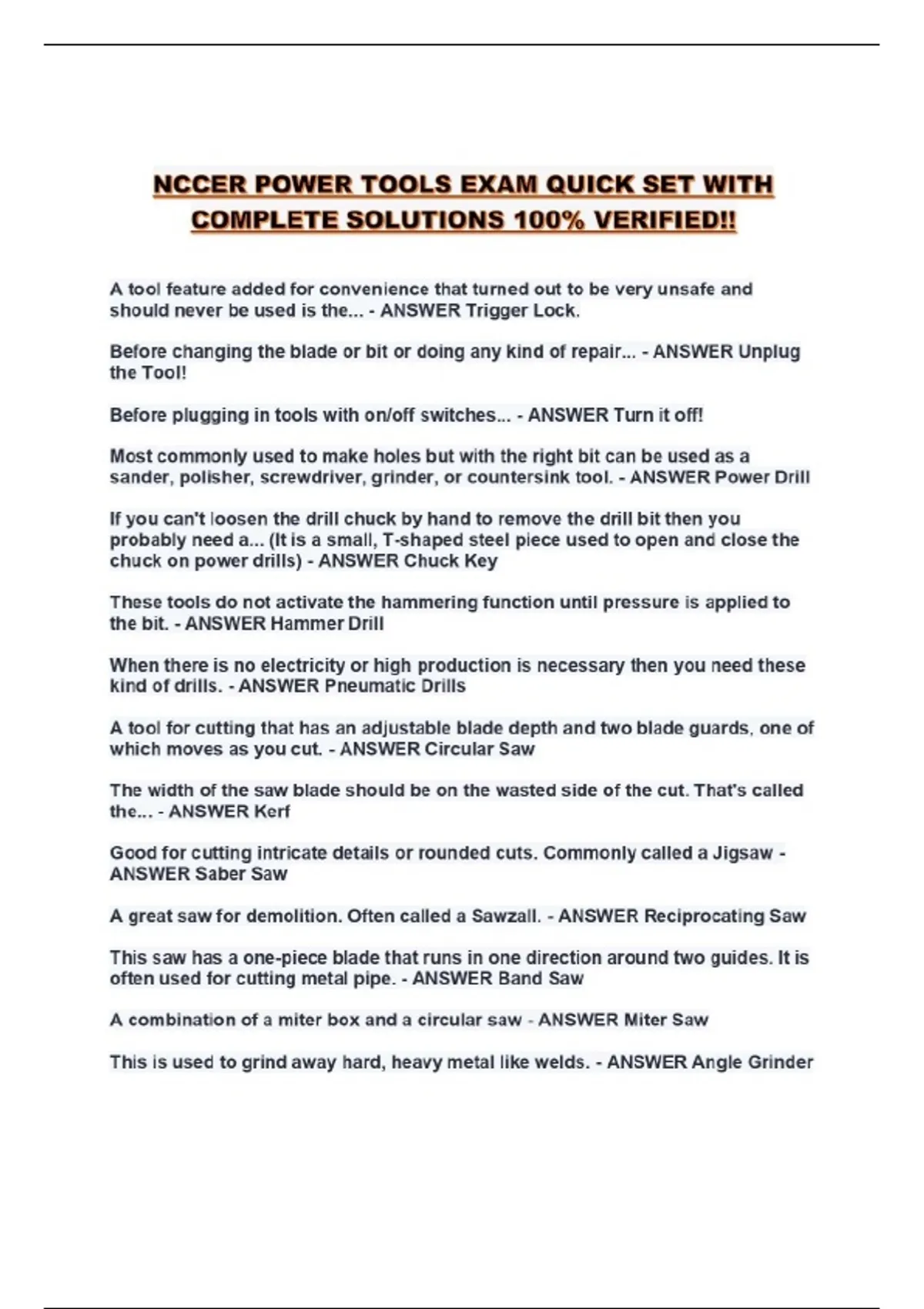 NCCER POWER TOOLS EXAM QUICK SET WITH COMPLETE SOLUTIONS 100% VERIFIED!!...