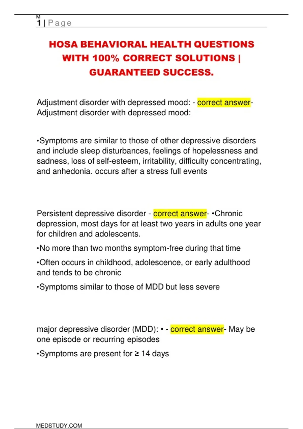 HOSA BEHAVIORAL HEALTH QUESTIONS WITH 100% CORRECT SOLUTIONS | GUARANTEED SUCCESS.