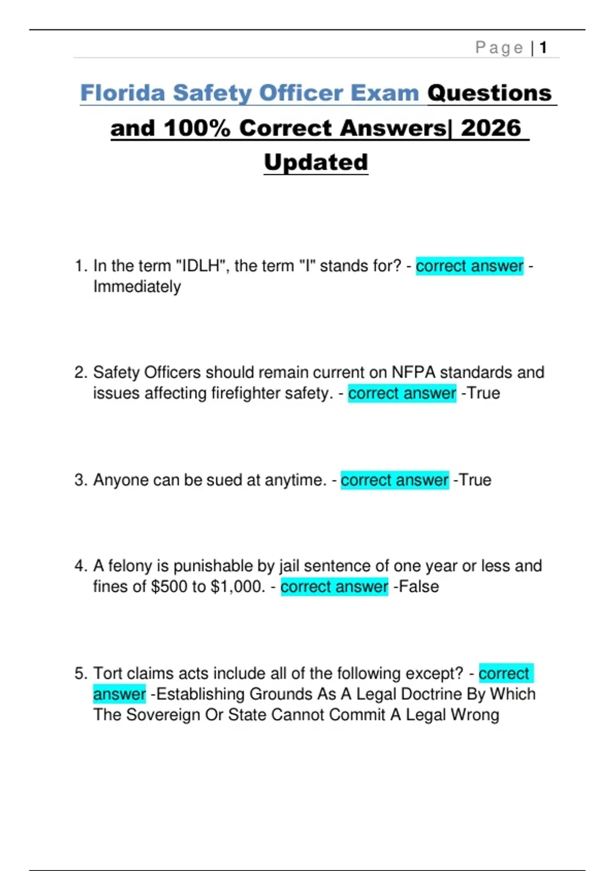 This document provides an extensive collection of Florida Safety Officer exam questions with verified correct answers, covering firefighter safety, incident safety officer roles, NFPA standards, OSHA regulations, risk management, investigations, and operational safety. It serves as a complete and up-to-date study guide for the 2026 Florida Safety Officer certification, suitable for exam preparation and refresher training.