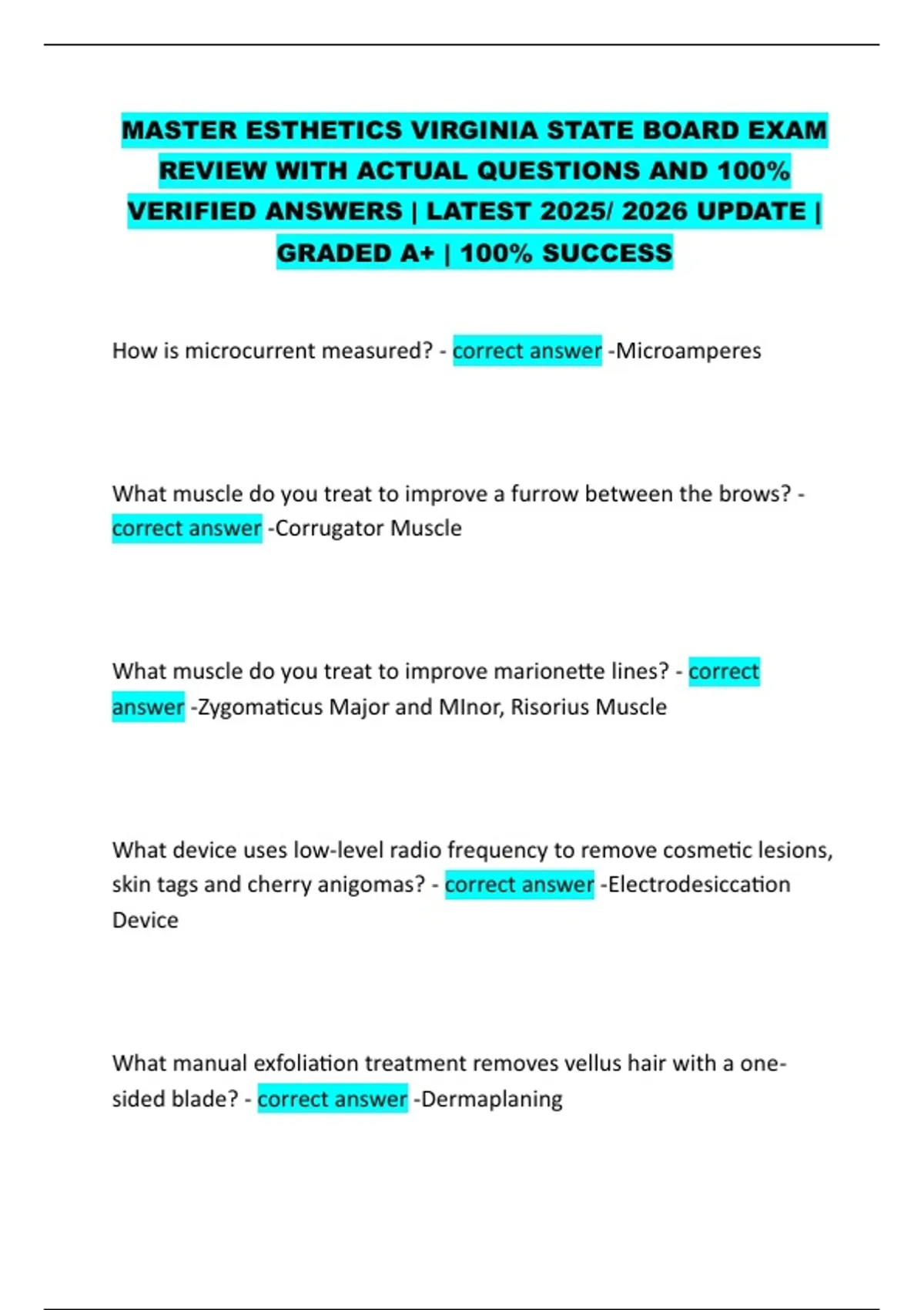 MASTER ESTHETICS VIRGINIA STATE BOARD EXAM REVIEW WITH ACTUAL QUESTIONS AND 100% VERIFIED ANSWERS | LATEST 2025/ 2026 UPDATE | GRADED A+ | 100% SUCCESS
