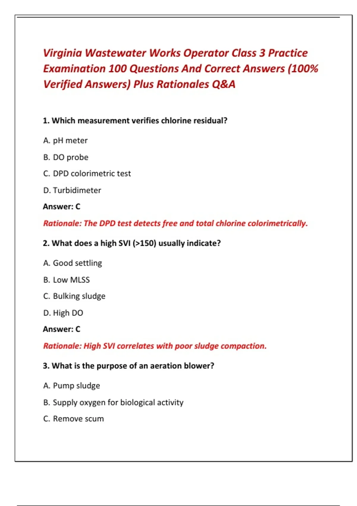 Virginia Wastewater Works Operator Class 3 Practice Examination 100 Questions And Correct Answers (100% Verified Answers) Plus Rationales Q&A 1. Which measurement verifies chlorine residual? A. pH meter B. DO probe C. DPD colorimetric test D. Turbidimeter Answer: C Rationale: The DPD test detects free and total chlorine colorimetrically. 2. What does a high SVI (>150) usually indicate? A. Good settling B. Low MLSS C. Bulking sludge D. High DO Answer: C Rationale: High SVI correlates with poor sludge compaction. 3. What is the purpose of an aeration blower? A. Pump sludge B. Supply oxygen for biological activity C. Remove scum D. Adjust alkalinity Answer: B Rationale: Blowers maintain aerobic conditions in activated sludge. 4. Which process converts ammonia to nitrate? A. Denitrification B. Precipitation C. Nitrification D. Flocculation Answer: C Rationale: Nitrification oxidizes ammonia to nitrite and nitrate. 5. What is the main purpose of secondary treatment? A. Remove large debris B. Remove most organics via biological processes C. Disinfect wastewater D. Thicken sludge Answer: B Rationale: Secondary treatment biologically reduces organic content. 6. Which safety device detects low oxygen in confined spaces? A. Sludge judge B. Oxygen meter C. Flow meter D. Barometer Answer: B Rationale: Oxygen meters ensure safe atmospheric conditions. 7. What process occurs when bacteria convert nitrate to nitrogen gas? A. Coagulation B. Denitrification C. Aeration D. Sedimentation Answer: B Rationale: Denitrification reduces nitrate under anoxic conditions. 8. What is the primary function of a digester mixing system? A. Reduce odor B. Maintain uniform temperature and solids distribution C. Increase flow rate D. Remove grit