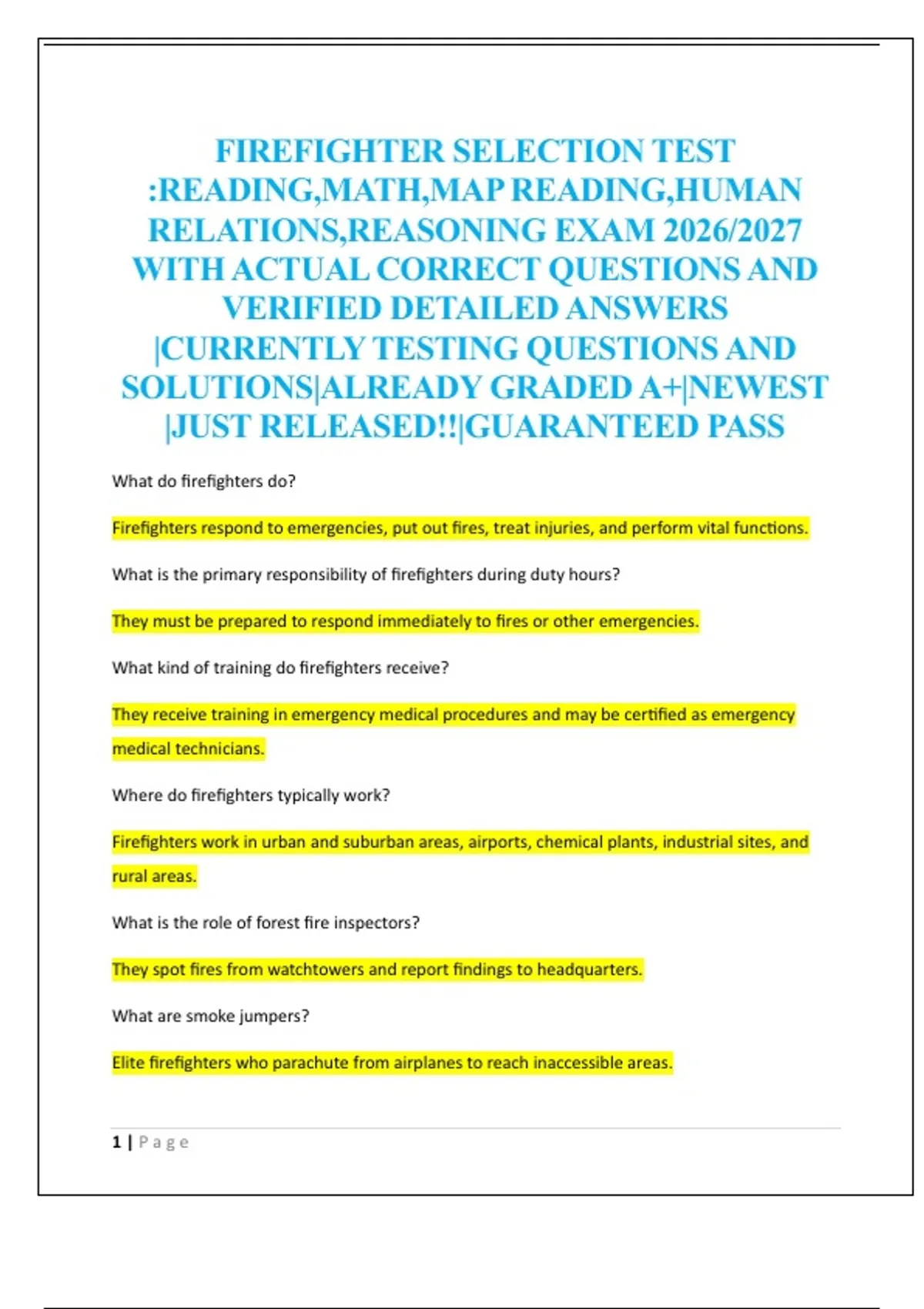 FIREFIGHTER SELECTION TEST :READING,MATH,MAP READING,HUMAN RELATIONS,REASONING EXAM 2026/2027 WITH ACTUAL CORRECT QUESTIONS AND VERIFIED DETAILED ANSWERS |CURRENTLY TESTING QUESTIONS AND SOLUTIONS|ALREADY GRADED A+|NEWEST |JUST RELEASED!!|GUARANTEED PASS