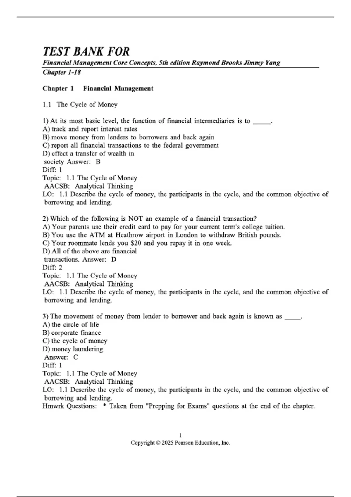 This is a comprehensive test bank for the 5th edition of Financial Management: Core Concepts. It provides exam-style questions across 18 chapters, covering the essential pillars of corporate finance. Key topics include the "Cycle of Money" and the role of financial intermediaries, financial statement analysis, the time value of money, risk and return, and capital budgeting. Each question includes verified answers, difficulty ratings, and specific learning objectives to ensure a thorough understanding of financial decision-making.