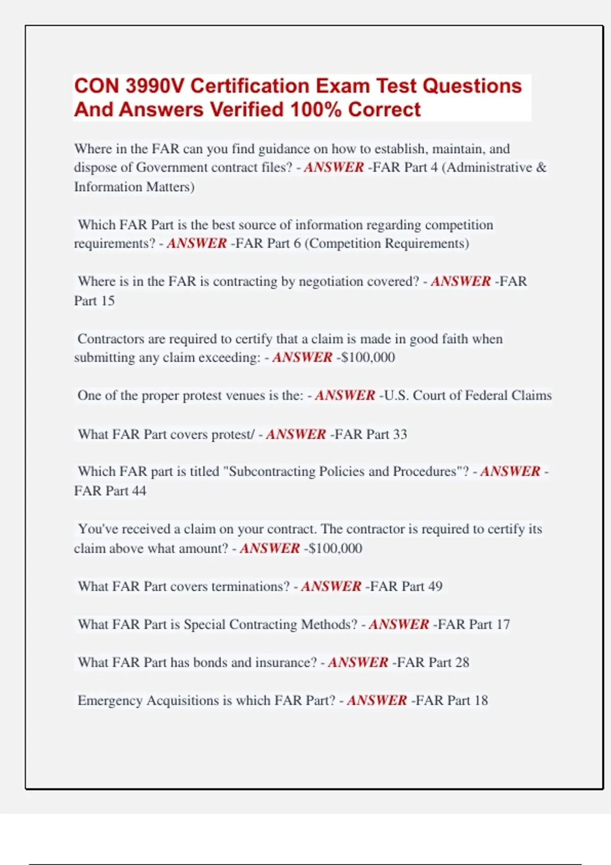 CON 3990V Certification Exam Test Questions And Answers Verified 100% Correct Where in the FAR can you find guidance on how to establish, maintain, and dispose of Government contract files? - ANSWER -FAR Part 4 (Administrative & Information Matters) Which FAR Part is the best source of information regarding competition requirements? - ANSWER -FAR Part 6 (Competition Requirements) Where is in the FAR is contracting by negotiation covered? - ANSWER -FAR Part 15 Contractors are required to certify that a claim is made in good faith when submitting any claim exceeding: - ANSWER -$100,000 One of the proper protest venues is the: - ANSWER -U.S. Court of Federal Claims What FAR Part covers protest/ - ANSWER -FAR Part 33 Which FAR part is titled "Subcontracting Policies and Procedures"? - ANSWER FAR Part 44 You've received a claim on your contract. The contractor is required to certify its claim above what amount? - ANSWER -$100,000 What FAR Part covers terminations? - ANSWER -FAR Part 49 What FAR Part is Special Contracting Methods? - ANSWER -FAR Part 17 What FAR Part has bonds and insurance? - ANSWER -FAR Part 28 Emergency Acquisitions is which FAR Part? - ANSWER -FAR Part 18 What is FAR Part 5? - ANSWER -Publicizing Contract Actions What is FAR Part 2? - ANSWER -Definitions of Words and Terms What is FAR Part 3? - ANSWER -Improper Business Practices and Personal Conflicts of Interest What is FAR Part 11? - ANSWER -Describing Agency Needs What is FAR Part 10? - ANSWER -Market Research What is FAR Part 7? - ANSWER -Acquisition Planning What is FAR Part 53? - ANSWER -Forms What FAR Part has Provisions & Contract Clauses? - ANSWER -FAR Part 52 Termination of Contracts is which FAR Part? - ANSWER -FAR Part 49 What FAR Part is Quality Assurance? - ANSWER -FAR Part 46 What is FAR Part 45? - ANSWER -Government Property What is FAR Part 44? - ANSWER -Subcontracting Policies and Procedures What is FAR Part 43? - ANSWER -Contract Modifications What is FAR Part 42? - ANSWER -Contract Administration and Audit Services What is FAR Part is 33? - ANSWER -Protests, Disputes & Appeal What is FAR Part 31? - ANSWER -Contract Cost Principles and Procedures What is FAR Part 9? - ANSWER -Contractor Qualifications What is FAR Part 15? - ANSWER -Contracting by Negotiation What is FAR Part 4? - ANSWER -Administrative and Information Matters What is FAR Part 13? - ANSWER -Simplified Acquisition Procedures What is FAR Part 19? - ANSWER -Small Business Programs What is FAR Part 12? - ANSWER -Acquisition of Commercial Items What is FAR Part 16? - ANSWER -Types of Contracts What is FAR Part 8? - ANSWER -Required Sources of Supplies and Services What is FAR Part 14? - ANSWER -Sealed Bidding FAR 13.004 states that ________________ - ANSWER -a quotation is not an offer, and consequently, cannot be accepted by the government to form a binding contract. FAR 13.106-2(a)(2) tells us that the contracting officer shall evaluate quotations or offers on the __________ - ANSWER -basis established in the solicitation What are the two broad categories of contract types? - ANSWER -Cost reimbursement Fixed Price True or False: A cost reimbursement type contract places upon the contractor maximum risk and responsibility for all costs and resulting profit or loss. - ANSWER -False True or False: Cost-reimbursement types of contracts require the contractor to put forth a best effort to perform, and provide for payment of the contractor's allowable, allocable and reasonable incurred costs. - ANSWER -True