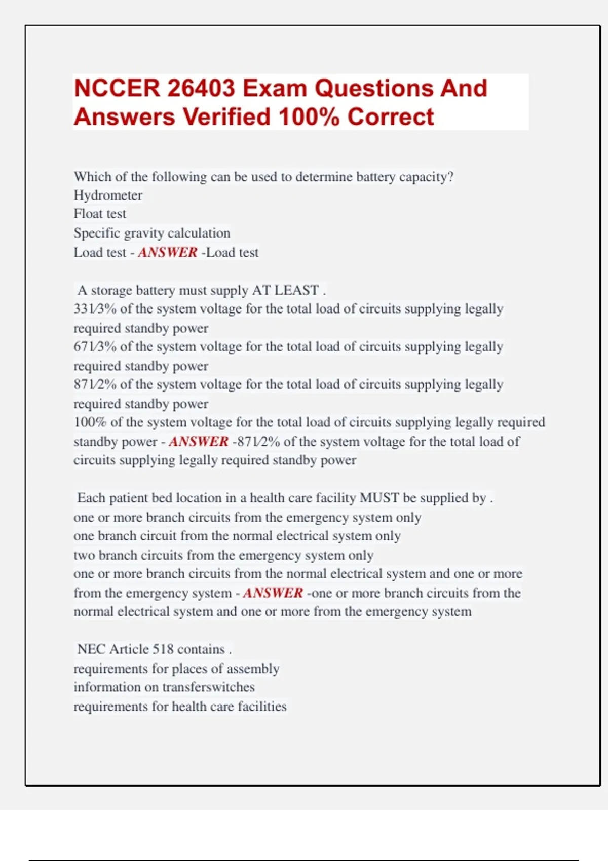 NCCER 26403 Exam Questions And Answers Verified 100% Correct Which of the following can be used to determine battery capacity? Hydrometer Float test Specific gravity calculation Load test - ANSWER -Load test A storage battery must supply AT LEAST . 331⁄3% of the system voltage for the total load of circuits supplying legally required standby power 671⁄3% of the system voltage for the total load of circuits supplying legally required standby power 871⁄2% of the system voltage for the total load of circuits supplying legally required standby power 100% of the system voltage for the total load of circuits supplying legally required standby power - ANSWER -871⁄2% of the system voltage for the total load of circuits supplying legally required standby power Each patient bed location in a health care facility MUST be supplied by . one or more branch circuits from the emergency system only one branch circuit from the normal electrical system only two branch circuits from the emergency system only one or more branch circuits from the normal electrical system and one or more from the emergency system - ANSWER -one or more branch circuits from the normal electrical system and one or more from the emergency system NEC Article 518 contains . requirements for places of assembly information on transferswitches requirements for health care facilities information on the installation of emergency systems - ANSWER -requirements for places of assembly NEC Article 701 covers the requirements for _. optional standby systems emergency systems storage batteries legally required standby systems - ANSWER -legally required standby systems The MOST common method of cooling standby generator sets is . liquid-to-liquid heatexchangers a mounted radiator with an engine-driven fan battery-powered systems compressed air systems - ANSWER -a mounted radiator with an engine-driven fan Which of the following commercial loads can be fed from a regular circuit rather than an emergency circuit? Exit lights Computer equipment Fire alarm systems Life safety systems - ANSWER -Computer equipment In an AC generator, the field windings are energized by the . rotor exciter armature stator - ANSWER -exciter Transfer switches are sized based on . 80% of the generator capacity 125% of the maximum critical load 150% of the emergency load the calculated continuous current - ANSWER -the calculated continuous current NEC Article 517 contains . requirements for places of assembly information on transferswitches requirements for health care facilities information on the installation of emergency systems - ANSWER -requirements for health care facilities The nominal open circuit voltage of a lead-acid cell is . 1.0V 2.0V 3.0V 4.0V - ANSWER -2.0V Overcharging a lead-acid battery will . destroy the positiveplate increase battery power extend battery life destroy the negative plate - ANSWER -destroy the positiveplate Which of the following is TRUE regarding a single-conversion UPS system? It has poor noise isolation from line to load. It provides excellent frequency stability. It supplies AC power directly to critical loads through a series inductor or transformer. It may achieve zero transfer time. - ANSWER -It supplies AC power directly to critical loads through a series inductor or transformer. An engine-driven AC generator may be oversized when serving a . farm fire pump HVAC system residence - ANSWER -fire pump