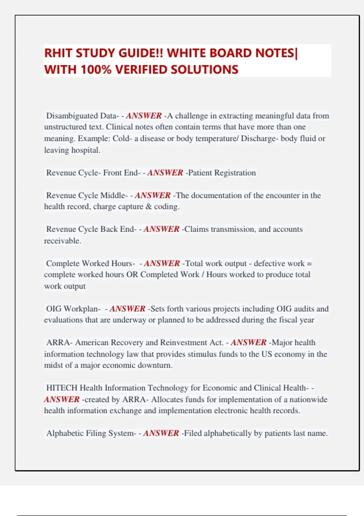 RHIT STUDY GUIDE!! WHITE BOARD NOTES| WITH 100% VERIFIED SOLUTIONS Disambiguated Data- - ANSWER -A challenge in extracting meaningful data from unstructured text. Clinical notes often contain terms that have more than one meaning. Example: Cold- a disease or body temperature/ Discharge- body fluid or leaving hospital. Revenue Cycle- Front End- - ANSWER -Patient Registration Revenue Cycle Middle- - ANSWER -The documentation of the encounter in the health record, charge capture & coding. Revenue Cycle Back End- - ANSWER -Claims transmission, and accounts receivable. Complete Worked Hours- - ANSWER -Total work output - defective work = complete worked hours OR Completed Work / Hours worked to produce total work output OIG Workplan- - ANSWER -Sets forth various projects including OIG audits and evaluations that are underway or planned to be addressed during the fiscal year ARRA- American Recovery and Reinvestment Act. - ANSWER -Major health information technology law that provides stimulus funds to the US economy in the midst of a major economic downturn. HITECH Health Information Technology for Economic and Clinical Health- - ANSWER -created by ARRA- Allocates funds for implementation of a nationwide health information exchange and implementation electronic health records. Alphabetic Filing System- - ANSWER -Filed alphabetically by patients last name. Straight Numeric- - ANSWER -Filed based directly by the record number in numeric order. Terminal- Digit filing- - ANSWER -Filed by the last two digits terminal digits then the middle two secondary unit then first two tertiary units. Centralized Unit Filing- - ANSWER -The patients encounters are filed in a single location. Alphanumeric Filing System- - ANSWER -First two letters of patients lastname followed by a uniquw numeric identifier. Ex. SA1234 Roll Microfilm- - ANSWER -Images stored on a long roll of film, major problem is that patient encounters can be stored on multiple rolls which can make retrieval difficult. Jacket Microfilm- - ANSWER -Microfilm is cut and inserted into 4x6 inch jackets with sleeves. Microfiche- - ANSWER -Copy of the jacket microfilm. Used to be sent out of the HIM Department instead of using the original Jacket Microfilm. Outguide- - ANSWER -Paper-based health record system to track the location of records removed. Record Reconciliation- - ANSWER -Making sure that all the records have been received by the HIM department after patient has been discharged. CMS- Federal Agency within the US department of Health and Human Services. - - ANSWER -Oversight of Medicare program and state governments. Accreditation- - ANSWER -Voluntary Conditions of Coverage- - ANSWER -Ensures patient quality, safety and improvement of clinical outcomes. Statute- - ANSWER -Piece of legislation written and approved by state/federal legislature, signed to law. Legal Health Record- - ANSWER -Defined by each organizations Documentation that supports revenue pursued by payers Documentation used for legal testimony Expressed Consent- - ANSWER -Consent given by their words or in writing. Implied Consent- Inferred by patients action like when patient sticks out arm for blood pressure Authorization- - ANSWER -Covered Entity may not use or disclose protected health information without consent, also a document required under Privacy Rule or HIPAA. EMTALA- - ANSWER -Emergency Medical Treatment and Active Labor Act- Determines if an emergency condition exists. Long Term Care- - ANSWER -Skilled Nursing Care, Subacute Care facilities, nursing facilities nursing homes, assisted living. Care plan format is called Resident Assessment Instrument RAI- based on Minimum Data Set MDS Patient Assessment Instrument PAI- - ANSWER -Completed shortly after admission and discharges Rehab Facilities are accredited through CARF - ANSWER -Commission on Accreditation of Rehabilitation Facilities Source Oriented Health Record- - ANSWER -Record is organized by source. Example: All nursing notes together.