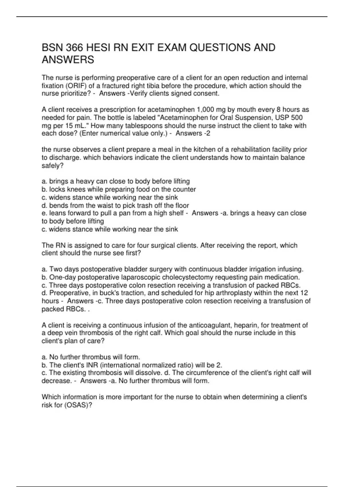 BSN 366 HESI RN EXIT EXAM QUESTIONS AND