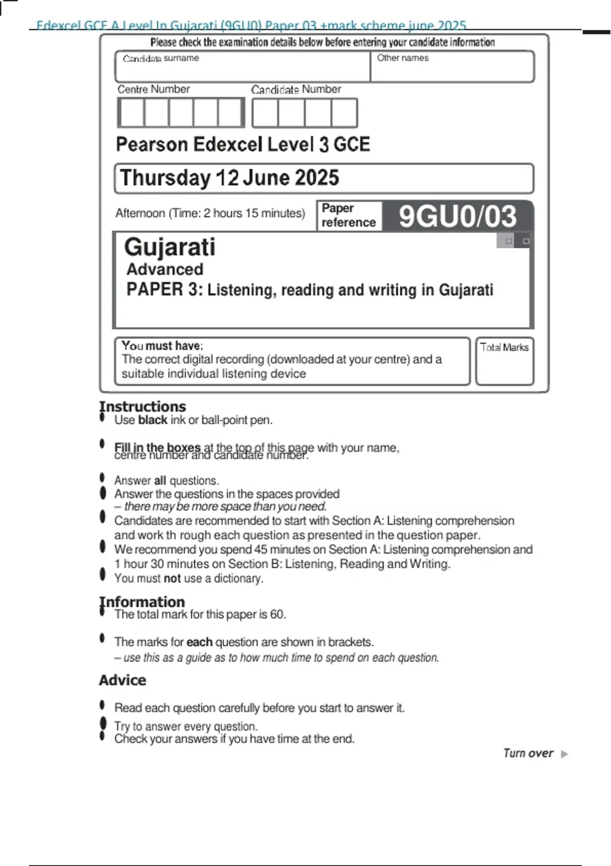 Edexcel GCE A Level In Gujarati Paper 03