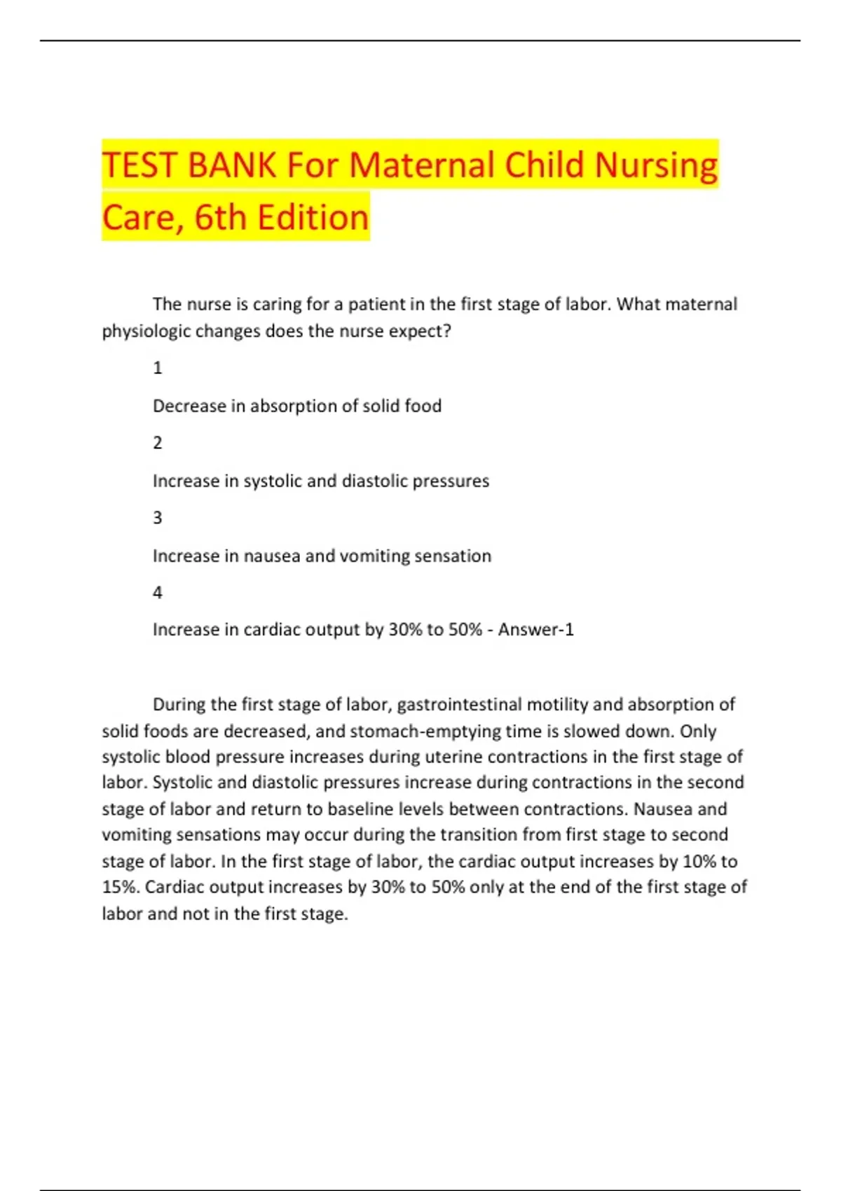 The nurse is caring for a patient in the first stage of labor. What maternal physiologic changes does the nurse expect? 1 Decrease in absorption of solid food 2 Increase in systolic and diastolic pressures 3 Increase in nausea and vomiting sensation 4 Increase in cardiac output by 30% to 50% - Answer-1 During the first stage of labor, gastrointestinal motility and absorption of solid foods are decreased, and stomach-emptying time is slowed down. Only systolic blood pressure increases during uterine contractions in the first stage of labor. Systolic and diastolic pressures increase during contractions in the second stage of labor and return to baseline levels between contractions. Nausea and vomiting sensations may occur during the transition from first stage to second stage of labor. In the first stage of labor, the cardiac output increases by 10% to 15%. Cardiac output increases by 30% to 50% only at the end of the first stage of labor and not in the first stage.