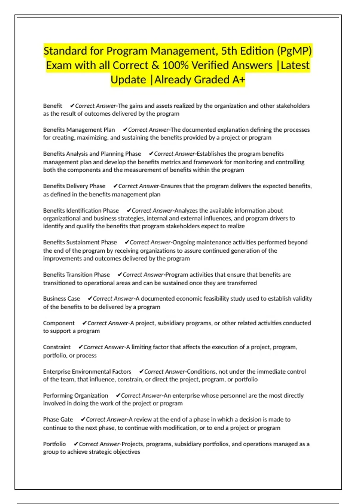 Standard for Program Management, 5th Edition (PgMP) Exam with all Correct & 100% Verified Answers |Latest Update |Already Graded A+