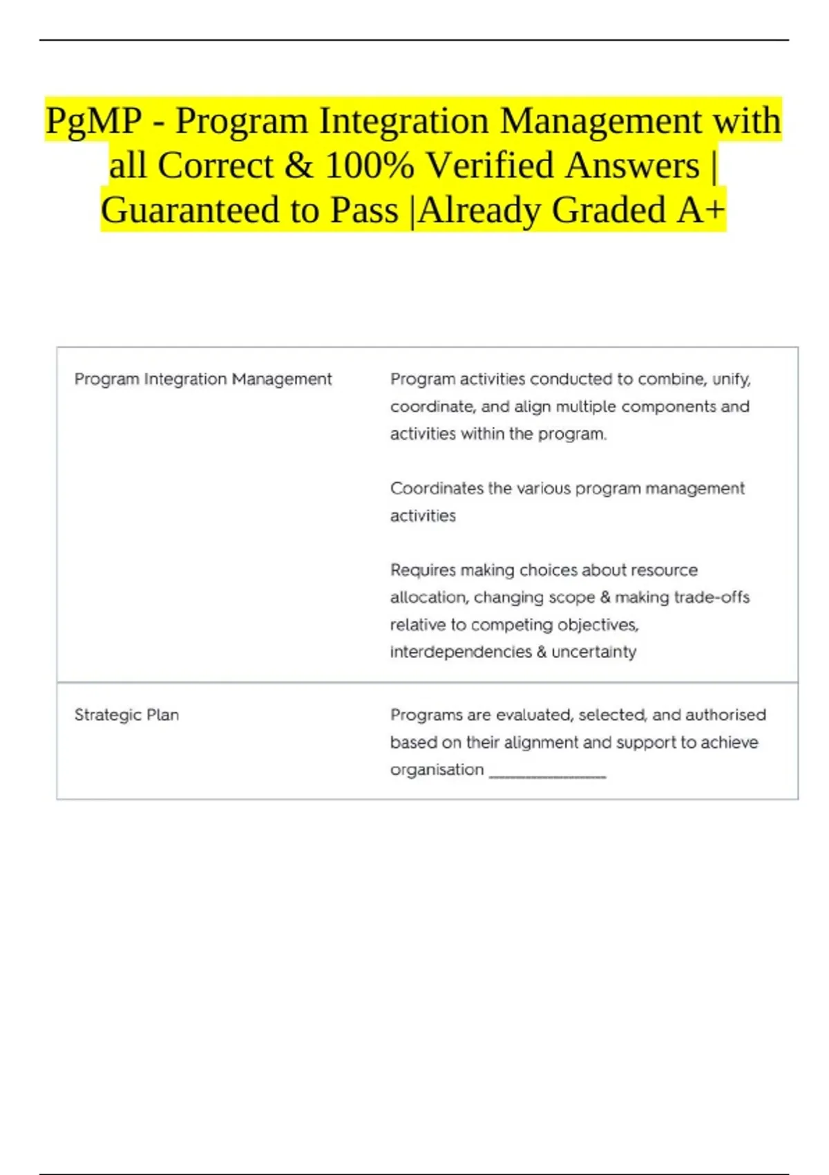 PgMP - Program Integration Management with all Correct & 100% Verified Answers |Guaranteed to Pass |Already Graded A+