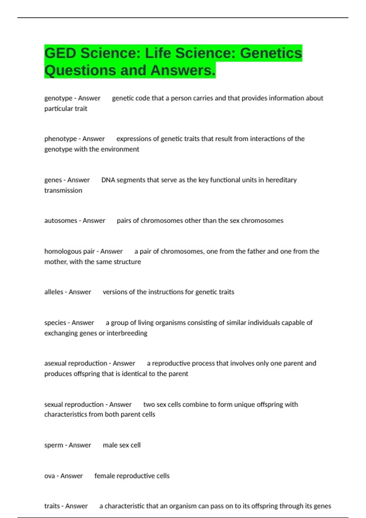 GED Science: Life Science: Genetics Questions and Answers.
