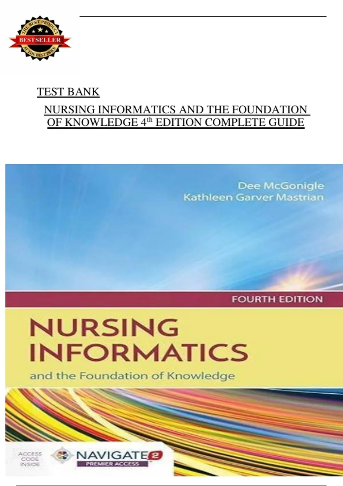 The Test Bank for Nursing Informatics and the Foundation of Knowledge, 4th Edition by Dee McGonigle and Kathleen Mastrian is a comprehensive academic assessment resource developed to support mastery of nursing informatics concepts in undergraduate and graduate nursing education. Fully aligned with the 4th edition textbook, this test bank follows the same chapter structure, learning objectives, and terminology, ensuring seamless integration into informatics-focused nursing courses. This complete test bank provides chapter-by-chapter multiple-choice questions with accurate, verified answers, addressing both theoretical foundations and practical applications of nursing informatics. Core topics include the Data–Information–Knowledge–Wisdom (DIKW) framework, information management, clinical knowledge development, and the role of informatics in nursing practice and decision-making. The test bank also covers electronic health records (EHRs), clinical decision support systems, health information technologies, interoperability, and the use of informatics to improve patient safety and care quality. Additional chapters focus on ethical, legal, and regulatory issues, including data privacy, security, confidentiality, and HIPAA compliance. Students are also assessed on emerging technologies, evidence-based practice, quality improvement, nursing leadership, and informatics competencies required in modern healthcare environments. Questions are structured to promote both factual recall and critical thinking, reflecting the style and rigor of nursing program examinations. For students, this resource functions as a powerful exam preparation and self-assessment tool, enabling systematic review of complex informatics concepts while reinforcing key terminology and frameworks. Exposure to exam-formatted questions enhances confidence and readiness for quizzes, midterms, finals, and comprehensive nursing informatics assessments. For instructors, the test bank offers a reliable foundation for constructing balanced examinations that align with course objectives and accreditation standards. Its comprehensive coverage allows educators to efficiently evaluate student understanding while maintaining consistency with the primary textbook. This test bank is especially valuable for BSN, RN-to-BSN, MSN, DNP, and healthcare informatics programs, where informatics literacy is essential for clinical practice, leadership, and evidence-based decision-making. Overall, the Test Bank for Nursing Informatics and the Foundation of Knowledge, 4th Edition is an essential companion resource that strengthens learning outcomes, improves exam performance, and supports the development of informatics-competent nursing professionals.