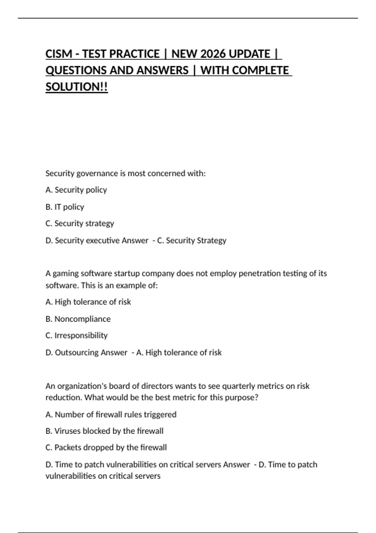 CISM - TEST PRACTICE | NEW 2026 UPDATE | QUESTIONS AND ANSWERS | WITH COMPLETE SOLUTION!!