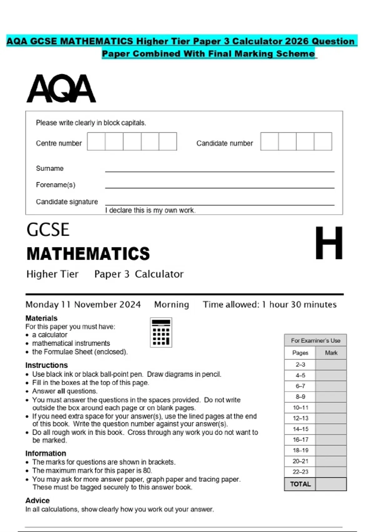 AQA GCSE MATHEMATICS Higher Tier Paper 3 Calculator 2026 Question Paper Combined With Final Marking Scheme