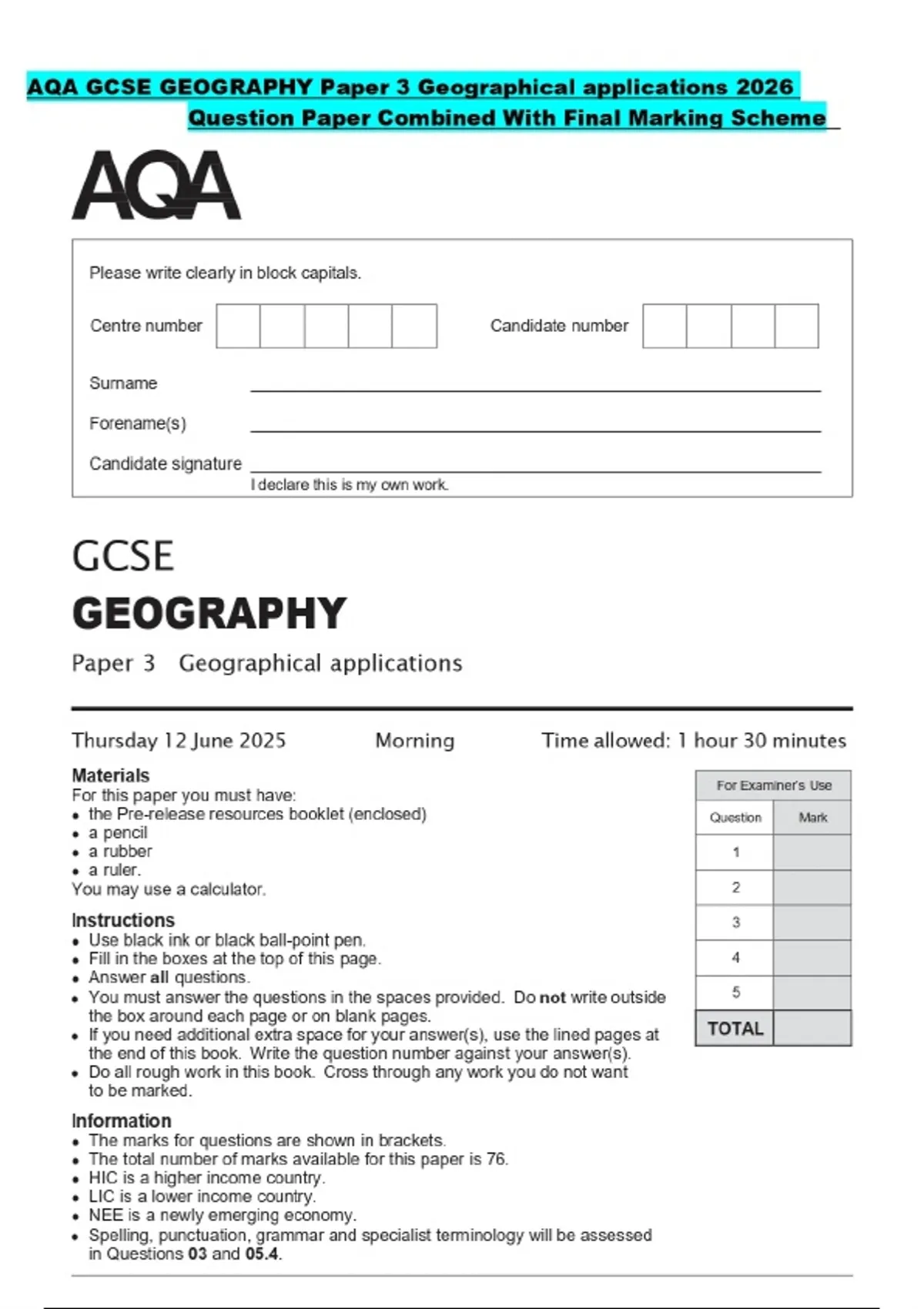 AQA GCSE GEOGRAPHY Paper 3 Geographical applications 2026 Question Paper Combined With Final Marking Scheme