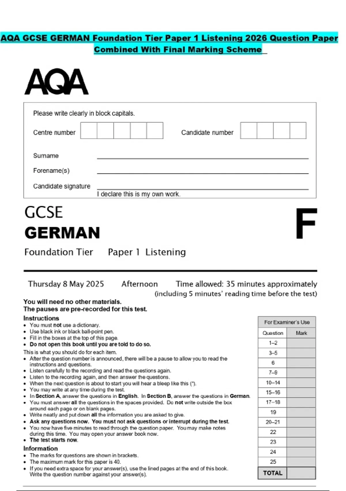 AQA GCSE GERMAN Foundation Tier Paper 1 Listening 2026 Question Paper Combined With Final Marking Scheme