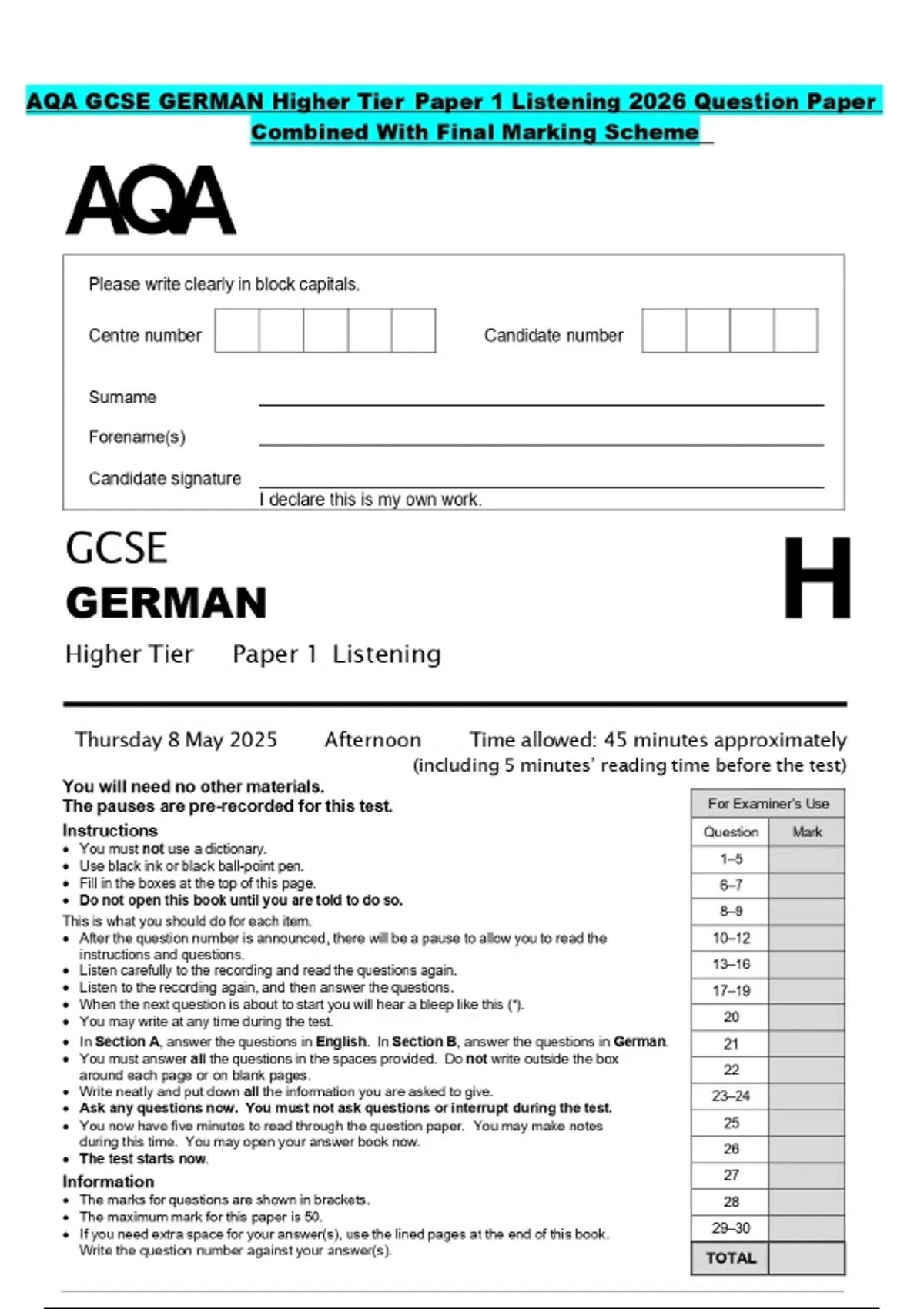 AQA GCSE GERMAN Higher Tier Paper 1 Listening 2026 Question Paper Combined With Final Marking Scheme
