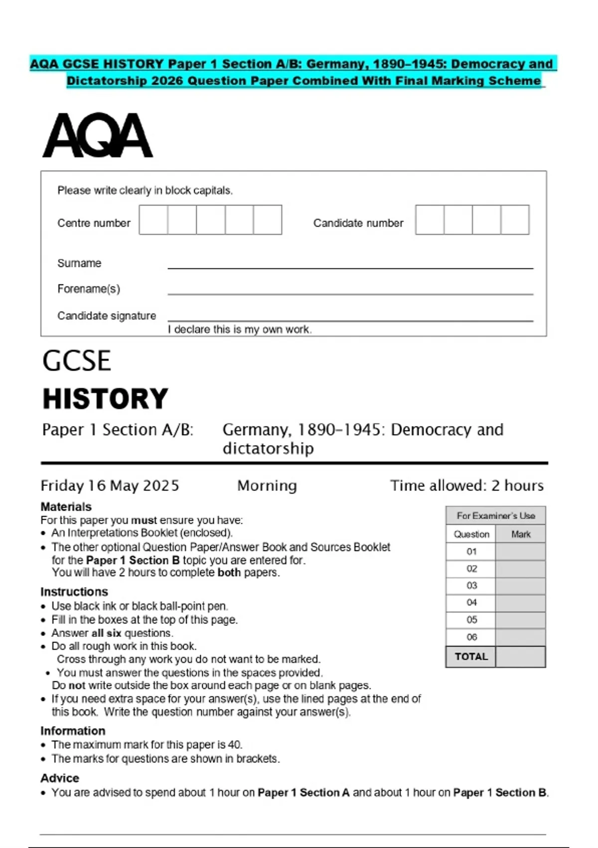 AQA GCSE HISTORY Paper 1 Section A/B: Germany, 1890–1945: Democracy and Dictatorship 2026 Question Paper Combined With Final Marking Scheme