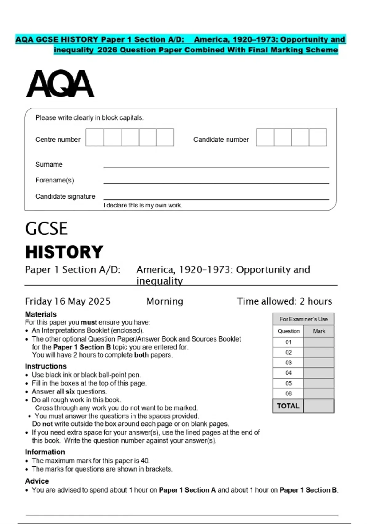AQA GCSE HISTORY Paper 1 Section A/D: America, 1920–1973: Opportunity and inequality 2026 Question Paper Combined With Final Marking Scheme