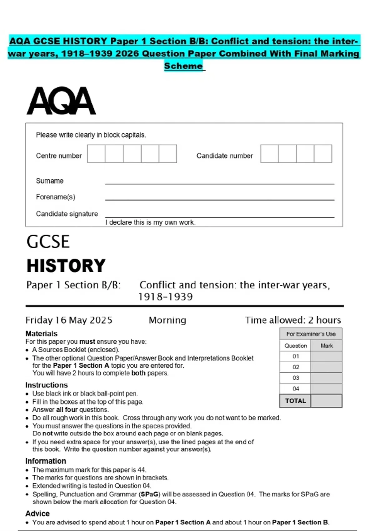 AQA GCSE HISTORY Paper 1 Section B/A: Conflict and tension: the First World War, 1894– Question Paper Combined With Final Marking Scheme